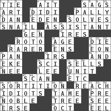 ACROSS 1. Make a knot 4. Small island 7. Settles 11. Nonscientific branch of learning 12. "You Light Up My Life" star Conn 13. Chummy 14. One of the 12 tribes of Israel 15. Genesis locale 16. Finds the solution 17. Slow-paced one 19. Aide 21. Commissioned military rank (abbr.) 23. Angers 24. Printing process, for short 25. Personal question 26. Expire 29. More uncommon 30. Followers of ems 31. Period of immesurable duration 32. Baking dish 33. Big collection agency 34. Plus 35. Make supply last 36. _-fi 37. Exchanges for money 40. Born 41. Area sheltered from the wind 42. A single undivided whole 43. Skim 45. And so on (abbr.) 46. Casting lots 51. Arrive at 55. Foolish or stupid persons 56. Docile 58. Before (prefix) 59. Having high moral qualities 60. Relationship diagram 61. Perceive with the eye 62. Celtic language 63. Sep. follower 64. Snakelike fish DOWN 1. Small amounts or degrees 2. SW Asia republic 3. Inactive volcano in Sicily 4. Assist 5. The main thing one is thinking about 6. Metal containers 7. Table seasonings 8. Inventor's middle name 9. Small, secluded valley 10. System (abbr.) 12. Erase 13. Airs 16. Fathers 18. Composer Stravinsky 20. Signals 22. Not either 24. The wife of a rajah (variant) 25. Nest on high 26. Started a card game 27. Charged particles 28. Conclusion 29. Immoral or dissolute person 32. Fenced enclosure 33. Ancient Celtic tribe of eastern Britain 36. Narrow boards 37. Take to court 38. Main course 39. Louse (plural) 43. Took without asking 44. Quote 46. Trig term 47. Aroma 48. Teases 49. "Beetle Bailey" pooch 50. Drug cop 52. Domed church section 53. Algonquian 54. Person who is morally reprehensible 57. Was introduced to