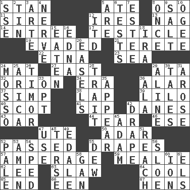 ACROSS 1. Comedian Laurel of Laurel & Hardy 5. Had dinner 8. Bear (Spanish) 11. Title for a man of rank and authority 12. Angers 13. Tired old horse 14. Main course 17. A testis 19. Dodged 21. Cigar-shaped 22. Inactive volcano in Sicily 23. Ocean 24. Floor protector 27. 90 degrees 29. _ moment's notice (2 wds.) 32. Constellation of myth 34. Epoch 36. Having or resembling wings 37. Simple or foolish person 38. Infant locale 39. _ and Stitch 40. Highlander 41. Small drink 42. Natives or inhabitants of Denmark 43. Rowing implement 44. Pull into pieces 46. Compass dir. 47. Shoshoni 50. The sixth month of the Jewish calendar 52. Went by 55. Window treatments 57. Electrical Measurement 59. Ear of corn 62. Area sheltered from the wind 63. Cole _ (cabbage dish) 64. Calm and collected 65. Conclude 66. Car or cant ending 67. Coop moms DOWN 1. Compass dir. 2. Shallow baking pan 3. Johnson of "Laugh-In" 4. Effrontery 5. "We ___ not amused" (Victoria) 6. Trials 7. First name in cosmetics 8. At one time in the past 9. Table seasoning 10. Double curve, resembling the letter S 12. It would 15. Consumed 16. Pulitzer Prize-winning author Ferber 18. Retirement account (abbr.) 20. Artist's stands 24. With motion or animation 25. N. Chile seaport 26. The easternmost of the Lesser Sundas 28. Distinguishing feature 29. Place in a line 30. Stories 31. Came up 33. Elect 35. Become visible 36. Insect wing 42. Window treatment 45. First of billions? 47. Purpose 48. Laconic 49. Peak District village in England 51. Arrive at 52. Diluted with white 53. So be it 54. Drove too fast 55. Morning condensation 56. _ gin 58. Separate the seeds from cotton 60. Electrically charged atom 61. Raised railways