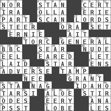 ACROSS 1. And not 4. Comedian Laurel of Laurel & Hardy 8. Certainty 12. Lyricist Gershwin 13. Spanish pot 14. One of the Great Lakes 15. Role in a play 17. Glance over 18. Domineers 19. Bull 21. Mouth or opening 23. Arrange properly for use 24. Bert's buddy 26. Small island 28. Torque (variant) 30. Commissioned military rank 34. English channel? 37. Shrivel 39. Naked 40. Snakelike fish 41. Having ears or earlike features 43. Allow 44. Put down 46. Play the lead 47. Followers of ems 48. Contrary to your interests or welfare 51. Pack (down) 54. Born 55. Let have 58. R.R. building 61. Tired old horse 63. Potato state 65. Tarsus (plural) 67. Medicinal plant 71. Agitate 72. Lyric poems 73. Suggestive of the supernatural 74. Santa ___, CA 75. Inconspicuous attention getter 76. Ear part 77. French article DOWN 1. Pinches, bites 2. Declaim 3. Less widely known 4. Mayday 5. Affectionate concern, for short 6. Insect wing 7. Billionth: prefix 8. Corporate head (abbr.) 9. Blunders 10. Travel on or in a vehicle 11. Trial 16. Portable shelter 18. (Had) reclined 20. River (Sp.) 22. Actress Charlotte 25. Celtic language 27. "___ Little Indians" 29. Desist 30. Relatively large 31. General guideline 32. Arabian gulf 33. Allows 34. Actor Lugosi 35. Necklace unit 36. 154 in Roman numerals 38. Tate display 42. To be drawn or hauled along 45. Lair 49. Painter Guido (1575-1642) 50. Ocean 52. Medical imaging device (abbr.) 53. Groovy apts. 56. Brizilian seaport 57. One or ones belonging to thee 58. Halt 59. Small amounts or degrees 60. Ancient Greek god of war 62. Highlander 64. Mouths or openings 66. Fast jet (abbr.) 68. Lion 69. Globe 70. Sight organ