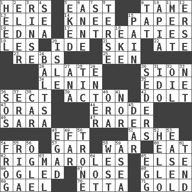 ACROSS 1. Possessive pronoun 5. 90 degrees 9. Docile 13. Writer Wiesel 14. Leg joint 15. Some stationery 16. Pulitzer Prize-winning author Ferber 17. Pleas 19. French article 20. Binary compound 21. What Jean-Claude Killy likes to do 22. Had dinner 23. Confederate soldiers (slang) 25. Car or cant ending 26. Having winglike extensions 30. The Jewish people; Israel 34. Soviet premier 1918-24 35. Singer Brickell 36. Religious group 39. NE Massachussets city 42. Stupid person 43. Mouths or openings 44. Wear away 46. "Two Mules for Sister ____" 47. Less widely known 48. Lizard (obsolete) 51. American tennis player Robert 54. Away 57. Slender fish 58. Armed conflict 60. Consume 62. Complicated, petty procedures 65. Otherwise 66. Stared 67. Olfactory organ 68. Small, secluded valley 69. Highlander 70. Singer James 71. Gilded DOWN 1. The bottom of a shoe or boot 2. A person who is older than you are 3. Remove soap 4. Ocean 5. Supplemented with great effort 6. Queen of England 1702-14 7. Put into a specified state 8. Laconic 9. Make lace 10. Capital of Western Samoa 11. Rendezvous 12. Celtic language 15. Ache 18. Make supply last 20. Small island 24. Greek mezzo-soprano Agnes 27. Santa ___, CA 28. Nervous spasm 29. Keyboard key 30. Spring feasts 31. Wedding promise 32. Lubricate 33. Remaining after all deductions 36. Mayday 37. Epoch 38. 4-wheeled motor vehicle 40. Mouth or opening 41. Not either 45. Letter starter 48. Mild oath 49. Distant 50. Heavy duty weighing machine 52. Phone greeting 53. Artist's stand 54. Toadlike animal 55. Port city in Latvia 56. Stare at amorously 58. 270 degrees 59. At sea 61. Watch over 63. Cartoonist voice _ Blanc 64. Car dealer's back yard 65. Ovum