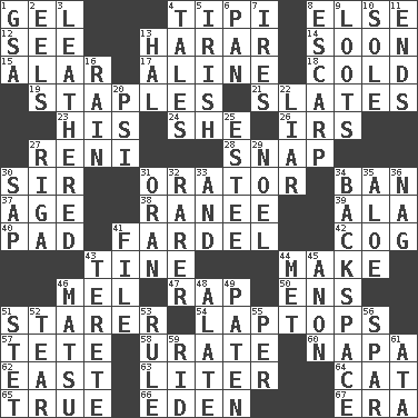 ACROSS 1. Set 4. Native american tent (variation) 8. Otherwise 12. Observe 13. Ethiopian city, capital of Harari 14. Within a short period 15. Having or resembling wings 17. Place in a line 18. Chilled 19. Paper fasteners 21. Chalkboards 23. Part of HMS, perhaps 24. A female animal or person 26. Big collection agency 27. Painter Guido (1575-1642) 28. Fastener 30. Title for a knight 31. Speaker 34. Forbid 37. Grow older 38. Indian princess (variant) 39. Insect wing 40. Writing tablet 41. Bundle 42. Gear tooth 43. Prong on a fork 44. Create 46. Cartoonist voice _ Blanc 47. Reproach for some lapse or misdeed 50. Followers of ems 51. A viewer who gazes fixedly 54. Portable computers 57. Wig 58. A salt of uric acid 60. California wine valley 62. 90 degrees 63. 61 cubic inches 64. Feline 65. Loyal 66. Paradise 67. Epoch DOWN 1. Girls' org. (abbr.) 2. Snakelike fish 3. Tough but pliablecoriaceous 4. Falsehoods 5. From or relating to Ireland 6. Baking dish 7. Angers 8. Fortification 9. Plunders 10. Flatfish 11. Conclusions 13. Actor Linden 16. Water falling in drops from the sky 20. 23rd letter of the Greek alphabet 22. One who doesn't tell the truth 25. First name in cosmetics 27. Capital of Latvia 29. Christmas carol 30. Plant excrement 31. NW Algerian seaport 32. More uncommon 33. Plus 34. Keyboard key 35. _ vera 36. Tired old horse 41. Do some clerical work 43. Cigar-shaped 44. Was introduced to 45. Soon (poet.) 46. Taiwanese island in East China Sea 48. Having winglike extensions 49. Eucharist need 51. Proofreading order 52. Pull into pieces 53. Court order 55. For each 56. Practice fight 59. To free from 61. "One Day ___ Time"