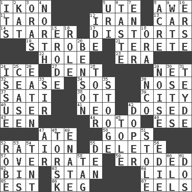 ACROSS 1. Image 5. Shoshoni 8. Deep reverence 11. Edible starchy tuberous root 12. SW Asia republic 13. Automobile 14. A viewer who gazes fixedly 17. What propaganda does 19. Disco prop 21. Cigar-shaped 22. Opening into or through something 23. Period 24. Frozen water 27. Gouge 29. Remaining after all deductions 32. Gospel singer Marvin 34. Distress signal 36. Olfactory organ 37. Suttee (variant) 38. Baseball player Mel 39. Municipality 40. One who uses or employs something 41. Modern: prefix 42. Administered medicine 43. Car or cant ending 44. Printing process, for short 46. Compass dir. 47. Had dinner 50. Republicans 52. Food allowance for one day 55. Erase 57. Make much ado about nothing 59. Eaten away 62. Storage container 63. Comedian Laurel of Laurel & Hardy 64. _ and Stitch 65. Eastern Standard Time (abbr.) 66. Cask 67. Snakelike fish DOWN 1. It is 2. Krazy ___ of comics 3. Mouths or openings 4. 0 degrees 5. RI univ. 6. Clothes sense 7. Keyboard key 8. 1/640 square mile 9. Electrical Unit 10. Celtic language 12. Binary compound 15. Wear away 16. Hero or heavy, e.g. 18. Mouth or opening 20. Gillaume's butler role 24. Come out of 25. Stop 26. Eroded 28. Carrier 29. Annoying sound 30. _____ Park, CO 31. Miss Universe 1986, Barbara Palacios _ 33. Title for a knight 35. Moe Howard, for one 36. Non-commissioned officer (abbr.) 42. Drug addict 45. Lacquered or enameled metalware 47. Atmosphere 48. Cod relative 49. Maternal 51. Took without asking 52. Loose flowing garment 53. Advice 54. Portable shelter 55. Lair 56. Singer Brickell 58. Label 60. Pipe bend 61. Two (Sp.)