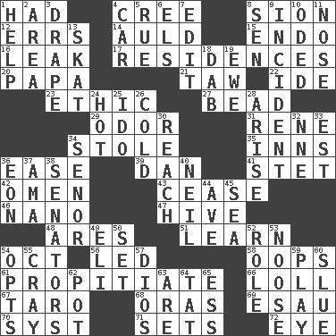ACROSS 1. Possessed 4. Algonquian 8. The Jewish people; Israel 12. Blunders 14. Old (Scot.) 15. Inside; within (prefix) 16. Path through which fluid escapes 17. Dwellings 20. Dad 21. The 23rd letter of the Hebrew alphabet 22. Binary compound 23. Principle of right and wrong 27. Necklace unit 29. Aroma 31. French philosopher Descartes 34. Took without asking 35. Taverns 36. Comfort 39. One of the 12 tribes of Israel 41. Proofreading order 42. Presage 43. Desist 46. Billionth: prefix 47. Hub of activity 48. Ancient Greek god of war 51. Acquire or gain knowledge or skills 54. Sep. follower 56. Directed 58. I made a mistake 61. Conciliate 66. Hang loosely or laxly 67. Edible starchy tuberous root 68. Mouths or openings 69. He sold his birthright 70. System (abbr.) 71. Puts into a specified state 72. Sight organ DOWN 1. Aid 2. Type of rug 3. Window treatment 4. Auto 5. Regret 6. Raised railways 7. Prepare for publication 8. Elected rep. 9. Event 10. Wrote a lyric poem 11. Characteristic smell of wine 13. Three-handed card game 18. Pat or tap gently 19. She-sheep 24. Being at a high temperature 25. Wedding promise 26. Lacking warmth 28. Get up 30. Arrive at 32. Compass dir. 33. Eastern Standard Time (abbr.) 34. Sir (Sp.) 36. Period of immesurable duration 37. Nursemaid (var.) 38. Legislators 40. Famous astronaut Armstrong 44. "___ Maria" 45. Ocean 49. Connecticut Ivy Leaguer 50. Arrange properly for use 52. Hero or heavy, e.g. 53. Trap for birds or small mammals 54. Elects 55. Supercomputer manufacturer 57. "Vaya con ____" 59. Shaw product 60. Turn sharply 62. Plant holder 63. "We ___ not amused" (Victoria) 64. Make lace 65. Curvy letter