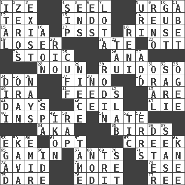 ACROSS 1. Ending with capital 4. Sew up the eyelids of hawks and falcons 8. Capital and largest city of Mongolia 12. John Ritter's dad 13. Southeast Asian peninsula 14. Reuben's nickname 15. Roberta Peters solo 17. Inconspicuous attention getter 18. Remove soap 19. Failure 21. Had dinner 23. Baseball player Mel 24. Unemotional 26. Santa ___, CA 28. Part of speech 30. Boisterous (Brazilian Portuguese) 34. Spanish title 37. Fine (Spanish) 39. To be drawn or hauled along 40. Lyricist Gershwin 41. Gives food to 43. "We ___ not amused" (Victoria) 44. 24-hour periods 46. To provide with a ceiling 47. Whopper 48. Heighten or intensify 51. Nathan's nickname 54. Alias (abbr.) 55. Avian creatures 58. Supplement with great effort 61. Choose 63. Small stream 65. Street urchin 67. Pismires 71. Comedian Laurel of Laurel & Hardy 72. Enthusiastic 73. Greater amount 74. Compass dir. 75. Have the gumption 76. Prepare for publication 77. To sift DOWN 1. Slanted text style (abbr.) 2. Nothings 3. Be 4. Small drink 5. Followers of ems 6. Begley and Asner 7. Globular water bottle used in Asia 8. RI univ. 9. Former U.S. Attorney General Janet 10. Abrupt rush of wind 11. Collude with 16. Period of immesurable duration 18. Painter Guido (1575-1642) 20. _ de Janeiro 22. The 19th letter of the Greek alphabet 25. _ links 27. Find the sum of 29. Sibling's daughter 30. "The Thinker" sculptor 31. Taken by mouth 32. Indian skirt 33. Double curve, resembling the letter S 34. "You Light Up My Life" star Conn 35. Northwest Algerian city 36. Negative votes 38. Born 42. Thick slice 45. Health resort 49. Picture 50. Reproach for some lapse or misdeed 52. Nervous spasm 53. Blunders 56. Prevent from occurring 57. Gospel singer Marvin 58. Mild oath 59. Polynesian shrub of the pepper family 60. Independent ruler or chieftain 62. Not wild 64. Leg joint 66. Binary compound 68. Allow head to fall sleepily 69. Three (prefix) 70. Arrange properly for use