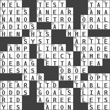 ACROSS 1. Cartoonist voice _ Blanc 4. Trial 8. Make lace 11. Jacques Cousteau's middle name 13. Approach 15. Santa ___, CA 16. Billionth: prefix 17. Paris' subway 18. Relating to the mouth 19. Goodbye (Sp.) 21. "One Day ___ Time" 22. Short-tailed, large-bodied rat 23. Layer 24. Part of HMS, perhaps 27. Madame (abbr.) 29. System (abbr.) 30. Nick name for Arthur 34. Electrical Unit 36. Pale green bean 39. Swap 40. Medicinal plant 41. Voters do this 43. So be it 44. Debunk (Brit. slang) 46. Singer James 47. Beverage made from leaves 48. Writing tables 49. Mitch Miller's instrument 51. Ewer handle 53. Science/research agcy. 54. Choose 57. Letter starter 60. It would 63. Eating place 65. Likelihood 66. Finish lines 69. One who doesn't tell the truth 70. To free from 71. Match 72. Allows 73. Consenting reply 74. Period of immesurable duration 75. Perceive with the eye DOWN 1. Non-adult bird? 2. Elude 3. Soviet premier 1918-24 4. Scottish cap 5. Compass dir. 6. Stalk of a moss capsule 7. Small pie 8. Pacific island yam 9. Of or related to the anus 10. Story 12. "Barney Miller" actor Jack 14. Wander aimlessly 18. Make much ado about nothing 20. Like a shrinking violet 25. Capri or Wight 26. Vertical member of a panel or frame 28. Floor covering 29. Orators 31. Docile 32. The main thing one is thinking about 33. Car or cant ending 34. Toward shelter 35. Disorderly crowds 37. Was introduced to 38. NE Massachussets city 40. Increase 42. Bar bills 45. Girls' org. (abbr.) 50. Often (poetically) 52. Capital of Latvia 54. Off-Broadway awards 55. Food holder 56. Laconic 57. Rowboat 58. Singer Brickell 59. Sums up 61. Ancient Roman robe 62. Have the gumption 64. 100% 67. Lion 68. Elected rep.