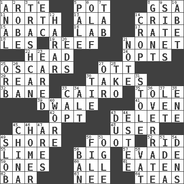ACROSS 1. Johnson of "Laugh-In" 5. Plant holder 8. Girls' org. (abbr.) 11. _ pole 13. Insect wing 14. Baby bed with high sides 15. Phillipine bananalike plant 16. Experiment locale 17. Pace 18. French article 19. Coral collection 21. Music written for nine 22. Froth on beer 24. Elects 25. Motion picture awards 27. Baseball player Mel 29. Located in or toward the back 30. Receives possession of 32. Object of repulsion 33. Capital of Egypt 35. Lacquered or enameled metalware 39. A sleeping potion; an opiate (poet.) 41. Baking chamber 42. Elect 43. Keyboard key 45. Burn to charcoal 48. One who makes use of a thing 49. Dinah or Pauly 50. One third of a yard 52. To free from 55. Citrus frut 56. Massive 57. Dodge 59. Singles 60. 100% 61. Ingested 62. Drinking establishment 63. Born 64. Beverages made from leaves DOWN 1. Of or related to the anus 2. Loose flowing garment 3. File 13 4. And so on (abbr.) 5. Light colored 6. Norwegian king 7. Keyboard key 8. Let have 9. Locates 10. Collude with 12. Ethiopian city, capital of Harari 14. Riding implement 20. Begley and Asner 21. Brief written record 23. Having ears or earlike features 25. Globe 26. Ocean 27. Rowing implement 28. Ring climax 30. Make a knot 31. Took without asking 33. Head covering 34. Keyboard modifier key 36. Make much ado about nothing 37. Allow 38. Compass dir. 40. Had on 43. Superhero pair 44. First name in cosmetics 45. Large country 46. Simpsons dad 47. Ancient Greek god of war 49. Oscar Madison type 50. Do some clerical work 51. Stare at amorously 53. The content of cognition 54. Hiding places for outlaws 56. Bar 58. Large container