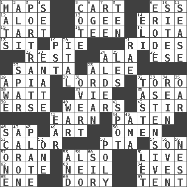 ACROSS 1. Atlas contents 5. Haul 9. Curvy letter 12. _ vera 13. Double curve, resembling the letter S 14. 4th largest of the Great Lakes 15. Small pie 16. Adolescent 17. Globular water bottle used in Asia 18. Be seated 19. Sliced dessert 21. Amusement-park features 22. Repose 24. Chicken ___ king 26. Compass dir. 27. Before Barbara or Clara 28. Toward shelter 29. Capital of Western Samoa 30. Titled peers of a realm 32. "Corrida" creature 36. Electrical Unit 37. Compete 38. Toward the sea 39. Celtic language 40. Puts on (as clothing) 42. Move through with a circular motion 43. Merit 44. Eucharist need 46. Plant excrement 49. Tate display 50. Sign of things to come 51. Bodily heat indicating an inflammation 53. Parent Teacher Association (abbr.) 54. Male child 57. Northwest Algerian city 58. In addition 61. Moving, as bait 62. Short letter 63. Famous astronaut Armstrong 64. Nights before holidays 65. Compass dir. 66. Dinghy 67. Portable shelter DOWN 1. Floor coverings 2. Jai ____ 3. Likenesses of persons 4. Arrange properly for use 5. ____ d'Azur (French Riviera) 6. Mature 7. To riddle 8. "___ Little Indians" 9. Wear away 10. Settings 11. Gospel singer Marvin 14. Biblical high priest 19. Pacific Standard Time (abbr.) 20. Slanted text style (abbr.) 21. Actress Charlotte 23. Maternal 24. Tree or shrub in the Birch family 25. French article 27. Coast Guard woman 28. Believer in; advocate of (suffix) 29. Deep reverence 31. Unconcealed 32. Clothes sense 33. Clearly or manifestly demonstrative 34. It's straight from the horse's mouth 35. Boat paddle 40. Armed conflict 41. Specific locale 43. Ewer handle 45. Housemaid (var.) 46. Biscuitlike quick bread 47. Composer Copland 48. Food holder 52. Single 53. More than one (prefix) 55. Baking chamber 56. Egg locale 58. Plus 59. Lion 60. Title for a knight 61. Allow