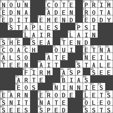 ACROSS 1. Part of speech 5. ____ d'Azur (French Riviera) 9. Demure 13. Pulitzer Prize-winning author Ferber 14. An important port of Yemen 15. Roll call or roster of names 16. Prepare for publication 17. Make improvements or corrections to 18. Whirlpool 19. Paper fasteners 21. Air pressure measure (abbr.) 22. Den 23. (Had) reclined 24. A female animal or person 27. Ocean 28. Look after 29. Team commander 31. Fr. "Yes" 32. Inactive volcano in Sicily 36. In addition 37. Had dinner 38. Famous astronaut Armstrong 39. Adolescent 40. Small island 41. Lacking originality or spontaneity 42. Unshakable 44. Cleo's killer 46. Perceive with the eye 47. Johnson of "Laugh-In" 48. Prejudice 50. Greek goddess of the dawn 51. Simpletons 54. Merit 56. Eat (away) 58. Allows 60. In a ____ (agitated or irritated) 61. Nathan's nickname 62. Margarine 63. Perceives with the eye 64. Hurried 65. Fast planes DOWN 1. Born 2. Probability 3. A single undivided whole 4. Brizilian seaport 5. Device for capturing images 6. Lyric poems 7. "___ Little Indians" 8. Conclusion 9. Elected leader of a country 10. "The Thinker" sculptor 11. It would 12. Can I? 17. Writer Wiesel 20. Romantic infatuation 21. Baking dish 23. Flowery wreath 24. Jazz singing style 25. Hollow 26. Comfort 28. Third day of the wk. 30. Meets 31. Baseball player Mel 33. Beverages made from leaves 34. The longest river in the world 35. Toward shelter 37. Direct toward a target or goal 40. "We ___ not amused" (Victoria) 41. Connect, as a bridge 43. ___ a Wonderful Life 44. Remained 45. Trig term 47. Nest on high 49. Grain storage towers 51. Make mention of 52. Snakelike fish 53. Proofreading order 54. Curvy letter 55. A saturated hydrocarbon 56. Followers of ems 57. Hit sharply and swiftly 59. Distress signal