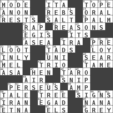 ACROSS 1. Method 5. Call ___ day 8. Drink excessively 12. Soon (poet.) 13. Confederate soldiers (slang) 15. Relating to the mouth 16. Musical pauses 18. Table seasoning 19. Inside of hand 20. Strike 22. Thinks logically 24. Armor plate that protects the chest 26. ___ a Wonderful Life 27. Toward the sea 28. Retirement account (abbr.) 29. Before (prefix) 32. Spoils 35. Bits 37. Myrna of the movies 38. In an inward manner 39. Corn or form start 40. Scorch 41. Cartoonist voice _ Blanc 42. Musical group of three 43. Docile 44. White ___ sheet 45. Layer 46. Pacific island yam 49. Wind 50. Sever or remove by pinching or nipping 51. Son of Zeus who helped slay Medusa 55. Electrical Unit 56. Falsehood 57. Relationship diagram 59. Public displays of written messages 63. SW Asia republic 64. Mild oath 65. Nanny 66. Inactive volcano in Sicily 67. Raised railways 68. Jennifer or Joel DOWN 1. Impair 2. Single 3. Two (Sp.) 4. Plea 5. Big collection agency 6. Pull apart 7. Competent 8. Literary convention 9. Northwest Algerian city 10. Friends 11. Shade tree 14. Flight of steps 17. Droops 21. Sliced dessert 23. R.R. building 25. Titan orbits this 28. Foolish or stupid persons 29. Entreaty 30. Wander 31. Jane of fiction 32. Pale green bean 33. Washington bills 34. Spanish pot 36. Cuckoo 40. Closing up, plugging up 42. Cylindrical with tapered ends 45. Part of HMS, perhaps 47. Santa ___, CA 48. Basketball hoops 49. Sports stadium 51. Piece 52. Liveliness 53. Goad 54. Lick closed 56. Neckwear 58. Begley and Asner 60. Slender fish 61. Compass dir. 62. Declare