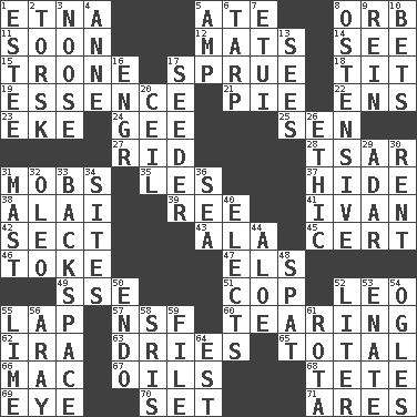 ACROSS 1. Inactive volcano in Sicily 5. Had dinner 8. Globe 11. Within a short period 12. Floor protectors 14. Perceive with the eye 15. Heavy duty weighing machine 17. Upset 18. Teat (slang) 19. Center 21. Sliced dessert 22. Followers of ems 23. Make supply last 24. Turn to the right 25. Elected rep. 27. To free from 28. Russian ruler of old 31. Disorderly crowds 35. French article 37. Flintstone garb 38. Mountain range southwest of Kyrgyzstan 39. To riddle 41. _ the terrible 42. Religious group 43. Chicken ___ king 45. Sure thing 46. Puff or smoke 47. Raised railways 49. Compass dir. 51. Police officer (slang) 52. Lion 55. Infant locale 57. Overdraft (abbr.) 60. Rending 62. Retirement account (abbr.) 63. Frees from moisture 65. "_____ Recall" 66. Apple computer (short form) 67. Petroleums 68. Wig 69. Sight organ 70. Put into a specified state 71. Ancient Greek god of war DOWN 1. First name in cosmetics 2. Cod relative 3. Trap for birds or small mammals 4. Queen of England 1702-14 5. Electrical Unit 6. Canvas cover 7. Needle case 8. Clearly or manifestly demonstrative 9. It's straight from the horse's mouth 10. Wagers 13. Observes 16. Engineer (abbr.) 17. Sowing specialist 20. To provide with a ceiling 26. Moral principle 29. The sixth month of the Jewish calendar 30. Monthly bill 31. Vertical spar for supporting sails 32. Margarine 33. Keyboard key 34. Settings 36. Ocean 40. Chooses 44. _ vera 48. Petty quarrel 50. Inside; within (prefix) 52. 61 cubic inches 53. Related on the mother's side 54. Stares at amorously 55. Citrus frut 56. Like ___ of sunshine 58. Indian titles of respect 59. Do some clerical work 61. Roll call or roster of names 64. Eastern Standard Time (abbr.)