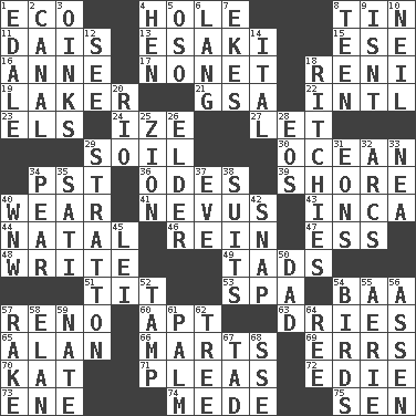 ACROSS 1. Environmental prefix 4. Opening into or through something 8. Shallow baking pan 11. Raised platform 13. 1973 Nobel Price Winner (Physics) Leo 15. Compass dir. 16. Singer Murray 17. Music written for nine 18. Painter Guido (1575-1642) 19. Member of a famous L.A. basketball team 21. Girls' org. (abbr.) 22. International (abbr.) 23. Raised railways 24. Ending with capital 27. Allow 29. Land 30. Sea 34. Pacific Standard Time (abbr.) 36. Lyric poems 39. Dinah or Pauly 40. Erode 41. Mole, birthmark 43. South American Indian 44. Brizilian seaport 46. It's straight from the horse's mouth 47. Curvy letter 48. Compose 49. Small boys 51. Teat (slang) 53. Health resort 54. Sound made by sheep 57. Former U.S. Attorney General Janet 60. Fitting 63. Frees from moisture 65. Actor Alda or Thicke 66. Shops 69. Blunders 70. Krazy ___ of comics 71. Entreaties 72. Singer Brickell 73. Compass dir. 74. Ancient Persian 75. Elected rep. DOWN 1. Peak District village in England 2. Lessep's creation 3. Pig sounds 4. Layer 5. Bear (Spanish) 6. Long (Scottish) 7. Makes supply last 8. Adolescent 9. Is not 10. Famous astronaut Armstrong 12. Observe 14. Slanted text style (abbr.) 18. Actors Guy, Robert Welles, and Clint 20. River (Sp.) 25. The Jewish people; Israel 26. A person who is older than you are 28. Greek goddess of the dawn 29. Ski resort town in Vermont 31. Immeasurably long periods of time 32. Arches 33. Teachers' org. 34. Lightbulb-shaped fruit 35. Suttee (variant) 37. Night before a holiday 38. Sets or collections 40. Compass dir. 42. Fastener 45. Flowery wreath 50. June honoree 52. Pack (down) 54. Avian creatures 55. Nest on high 56. NE Netherlands city 57. Immoral or dissolute person 58. Liveliness 59. Nathan's nickname 61. Inside of hand 62. Woody plant 64. To separate or throw off 67. Small boy 68. Compass dir.