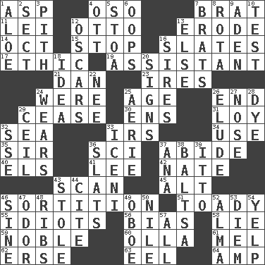 ACROSS 1. Viper 4. Bear (Spanish) 7. Naughty child 11. Flowery wreath 12. "Beetle Bailey" pooch 13. Wear away 14. Sep. follower 15. Cease 16. Chalkboards 17. Principle of right and wrong 19. Aide 21. One of the 12 tribes of Israel 23. Angers 24. We are 25. Ripen 26. Conclude 29. Desist 30. Followers of ems 31. Myrna of the movies 32. Ocean 33. Big collection agency 34. Purpose 35. Title for a knight 36. _-fi 37. Remain 40. Raised railways 41. Area sheltered from the wind 42. Nathan's nickname 43. Examine hastily 45. The first octave above the treble staff 46. Drawing lots 51. Sycophant 55. Foolish or stupid persons 56. Prejudice 58. Falsehood 59. Having high moral qualities 60. Water jar 61. Cartoonist voice _ Blanc 62. Celtic language 63. Snakelike fish 64. Electrical Unit DOWN 1. Medicinal plant 2. Religious group 3. Essential or central part 4. Baseball player Mel 5. Portico 6. I made a mistake 7. Naughty children 8. Round or rotation of duties 9. An important port of Yemen 10. Trial 12. Motion picture awards 13. Otherwise 16. Founders of families 18. The main thing one is thinking about 20. Public displays of written messages 22. Born 24. Puts on (as clothing) 25. Nest on high 26. Dodge 27. Characteristic smell of wine 28. Color 29. To provide with a ceiling 32. Compass dir. 33. Ancient Celtic tribe of eastern Britain 36. Narrow boards 37. Santa ___, CA 38. Greek mezzo-soprano Agnes 39. "Tell ____ the Marines!" 43. Fur scarf 44. Quote 46. Trig term 47. Aroma 48. Teases 49. Mitch Miller's instrument 50. The longest river in the world 52. _ mater 53. South Vietnam president (1954) 54. Sharp bark 57. Everything
