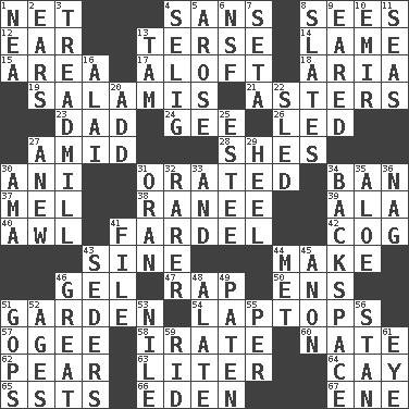 ACROSS 1. Remaining after all deductions 4. Without 8. Observes 12. Hearing organ 13. Laconic 14. Unable to walk 15. Type of rug 17. At or to great height 18. Operatic vocal solo 19. Deli grouping 21. Michaelmas daisies 23. Male parent 24. Turn to the right 26. Directed 27. Among 28. "______ My Girl" (Turtles hit) 30. Cuckoo 31. Declaimed 34. Bar 37. Cartoonist voice _ Blanc 38. Indian princess (variant) 39. According to 40. Leather borer 41. Bundle 42. Gear tooth 43. Trig term 44. Cause to be 46. Set 47. Hit sharply and swiftly 50. Followers of ems 51. Place where plants grow 54. Portable computers 57. Double curve, resembling the letter S 58. Feeling or showing extreme anger 60. Nathan's nickname 62. Lightbulb-shaped fruit 63. 61 cubic inches 64. Island 65. Fast planes 66. Genesis locale 67. Compass dir. DOWN 1. Teachers' org. 2. Hearing organs 3. Excercise machine 4. Major League Baseball Commissioner Bud 5. Came up 6. Science/research agcy. 7. Stalk of a moss capsule 8. Chalkboards 9. Having ears or earlike features 10. Arab leader 11. Oceans 13. Scottish cap 16. Jai ____ 20. Increase 22. Downhill vehicle 25. First name in cosmetics 27. Afresh 29. The bottom of a shoe or boot 30. Nursemaid (var.) 31. Northwest Algerian city 32. Less widely known 33. Added to 34. Keyboard key 35. Medicinal plant 36. Tired old horse 41. Do some clerical work 43. Spring feasts 44. Was introduced to 45. Soon (poet.) 46. Relatively large 48. Having winglike extensions 49. Eucharist need 51. Republicans 52. Eras 53. "Death on the ____" 55. For each 56. Comedian Laurel of Laurel & Hardy 59. To free from 61. Sight organ