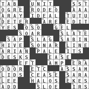 ACROSS 1. Bar bill 4. A single undivided whole 8. Fast jet (abbr.) 11. Legendary monster 13. Cowboy competition 15. Auto club (abbr.) 16. Like ___ of sunshine 17. Standard of perfection 18. Ballerina skirt 19. Prevent from occurring 21. "We ___ not amused" (Victoria) 22. Prepare for publication 23. Consenting reply 24. Bear (Spanish) 27. Set 29. Fly high 30. Chalkboard 34. Plant excrement 36. Volcanic refuse 39. Unit of acoustic absorption 40. Hub of activity 41. Underwater navigation system 43. Actor's bit 44. Believer in; advocate of (suffix) 46. Light colored 47. ___ a Wonderful Life 48. Writing tables 49. Relaxation 51. Lizard (obsolete) 53. Electrical Unit 54. Epoch 57. Scent 60. And so on (abbr.) 63. Indian state 65. Hats (slang) 66. Stop 69. "Two Mules for Sister ____" 70. Area sheltered from the wind 71. Radiant circles of light 72. Supplements with great effort 73. Increase 74. _ gin 75. Big collection agency DOWN 1. Sycophant 2. Match 3. Naughty children 4. RI univ. 5. Lower and raise head in agreement 6. The content of cognition 7. Separate forcefully 8. Saudi Arabian king (1953-1964) 9. Suttee (variant) 10. Drawn tight 12. Sight organ 14. Cassini of fashion 18. Copy Pinocchio 20. Friend of Pooh 25. Backtalk 26. Lowest deck of a ship 28. Double-curved letter 29. Orators 31. "This won't hurt ____!" 32. Airtight sealed metal containers 33. Compass dir. 34. Father 35. Advice 37. Santa ___, CA 38. An organ shaped like a helmet 40. Possessed 42. 480, 500 or 516 sheets of paper 45. Science/research agcy. 50. Health resort 52. Technology 54. 1973 Nobel Price Winner (Physics) Leo 55. Less widely known 56. Collect or gather 57. Spanish pot 58. Passed on 59. Wrote a lyric poem 61. Afternoon social gatherings 62. Give a ring to 64. Compass dir. 67. "Barney Miller" actor Jack 68. Compass dir.