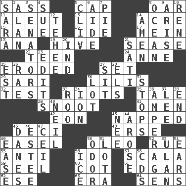 ACROSS 1. Backtalk 5. Head covering 8. Rowing implement 11. Native American of Southwest Alaska 13. Cards in a Roman deck? 14. 1/640 square mile 15. Indian princess (variant) 16. Binary compound 17. Count _ (2 wds.) 18. Santa ___, CA 19. Hub of activity 21. Gospel singer Marvin 22. Adolescent 24. Queen of England 1702-14 25. Eaten away 27. Put into a specified state 29. Indian skirt 30. Ms. Damita and namesakes 32. Trial 33. Debaucheries 35. Lie 39. Snout, nose 41. Presage 42. Period of immesurable duration 43. Slept 45. Tenth: prefix 48. Celtic language 49. Artist's stand 50. Margarine 52. Sorrow 55. Opposed to 56. Wedding promise 57. Any of the three canals of the cochlea 59. Stitch closed the eyes of (a falcon) 60. Small bed 61. _ Allan Poe 62. Compass dir. 63. Epoch 64. Elected reps. DOWN 1. "Two Mules for Sister ____" 2. Actor Alda or Thicke 3. Legislators 4. Take to court 5. 154 in Roman numerals 6. Assistant 7. Sliced dessert 8. Sea 9. Originate 10. French philosopher Descartes 12. Giggle 14. So be it 20. Working for oneself (abbr.) 21. Suttee (variant) 23. Prepares for publication 25. Eastern Standard Time (abbr.) 26. Actress Charlotte 27. Be seated 28. Raised railways 30. Car dealer's back yard 31. Constricts 33. Friend of Pooh 34. Electrically charged atom 36. Electrical Measurement 37. Area sheltered from the wind 38. Conclude 40. Famous astronaut Armstrong 43. Born 44. Came up 45. Natives or inhabitants of Denmark 46. First name in cosmetics 47. To provide with a ceiling 49. Comfort 50. Scent 51. Globular water bottle used in Asia 53. ____ Bator, Mongolia 54. Hearing organs 56. Frozen water 58. Music discs