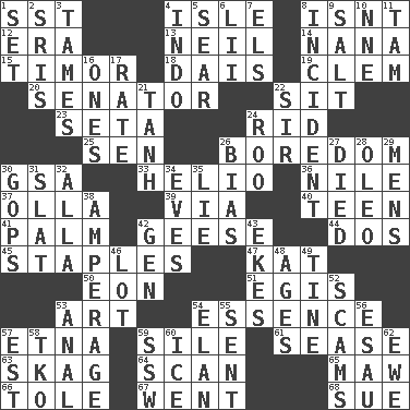 ACROSS 1. Fast jet (abbr.) 4. Small island 8. Is not 12. Period 13. Famous astronaut Armstrong 14. Nanny 15. Southeast Indonesia island 18. Raised platform 19. Clement's nick name 20. Elected representative 22. Be seated 23. Stalk of a moss capsule 24. To free from 25. Elected rep. 26. Mood resulting from idleness 30. Girls' org. (abbr.) 33. Sun: prefix 36. Mediterranean tributary 37. Rounded earthenware pot or jar 39. By way of 40. Adolescent 41. Inside of hand 42. Honkers 44. Two (Sp.) 45. Paper fasteners 47. Krazy ___ of comics 50. Period of immesurable duration 51. The front part of a cuirass 53. Tate display 54. Core 57. Inactive volcano in Sicily 59. Drop; flow; fall 61. Gospel singer Marvin 63. Heroin 64. Examine hastily 65. Informal term for the mouth 66. Lacquered or enameled metalware 67. Gone 68. Take to court DOWN 1. Arrange properly for use 2. Indian titles of respect 3. Makes less strong or intense 4. _ china 5. Shrivel 6. Cards in a Roman deck? 7. Raised railways 8. Event 9. Table seasoning 10. Compass dir. 11. Scottish cap 16. Singles 17. Assign a rank or rating to 21. Hyperbolic tangent 22. Title for a knight 24. Friend of Pooh 26. Prejudice 27. Passed on 28. Butter sub 29. Not women's 30. Republicans 31. Narrow board 32. Silent film actress Nazimova 34. Nights before holidays 35. Falsehood 38. Electrical Measurement 42. Commissioned military rank (abbr.) 43. Makes supply last 46. Car dealer's back yard 48. Grows older 49. Prong on a fork 52. Fraudulent business schemes 53. Of or related to the anus 54. Enthusiasm 55. Posted 56. He sold his birthright 57. Eastern Standard Time (abbr.) 58. Ring climax 59. Compass dir. 60. Frozen water 62. She-sheep