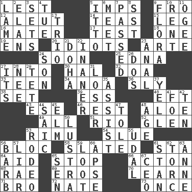 ACROSS 1. For fear that 5. Naughty children 9. Back 12. Eskimo relative 14. Afternoon social gatherings 15. Part of a journey 16. Mother 17. Trial 18. Single 19. Followers of ems 20. Foolish or stupid persons 23. Johnson of "Laugh-In" 24. Within a short period 25. Pulitzer Prize-winning author Ferber 27. To the inside or interior of 30. Actor Linden 32. ___ good deed 33. Adolescent 34. Small Philippine buffalo 36. Insidious 38. Put into a specified state 39. Double-curved letter 40. Newt 43. Compass dir. 46. Repose 48. Medicinal plant 49. Everything 51. River (Sp.) 52. Small, secluded valley 53. Tall New Zealand timber tree 54. Turn sharply 56. Group of countries in special alliance 58. Scheduled 61. R.R. building 64. Assist 65. Cease 66. 13-14th century defensive garment 68. Actress Charlotte 69. Greek god of love 70. Memorize 71. Sis' sibling 72. Nathan's nickname 73. Single time DOWN 1. Unable to walk 2. Liveliness 3. Arranges properly for use 4. Third day of the wk. 5. "Tell ____ the Marines!" 6. Rendezvous 7. Went by 8. Fast jet (abbr.) 9. Plants 10. Monthly bill 11. Double curve, resembling the letter S 13. Musical group of three 21. Capital of the state of Qatar 22. More empty; more void 23. Of or related to the anus 24. Male offspring 26. Two (Sp.) 27. It is 28. Born 29. Wig 31. Failure 35. Aid 37. Shout 41. Enemy 42. Nine, plus one 44. Ketch in the Levant 45. Shade tree 47. Lacquered or enameled metalware 48. Mature 50. A period of five years 53. Cowboy competition 55. Allodial 56. Sharp remark 57. One who doesn't tell the truth 59. Spoils 60. Domed church section 61. Comedian Laurel of Laurel & Hardy 62. Torque (variant) 63. Queen of England 1702-14 65. Elected rep. 67. Corporate head (abbr.)