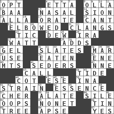 ACROSS 1. Elect 4. Singer James 8. Water jar 12. Sound made by sheep 13. Rhinal 14. The Jewish people; Israel 15. Silent film actress Nazimova 17. Speak pompously 18. Patter 19. Turned at an angle; bent 21. Gives out a loud, resonant sound 23. Nervous spasm 24. Morning condensation 26. Lyricist Gershwin 27. Electrical Unit 28. Does sums 30. Set 31. Chalkboards 34. Third mo. 37. Purpose 38. Eroded 39. Compass dir. 40. Mountains (abbr.) 41. Spring feasts 42. Compass dir. 43. Give a ring to 44. Periodic rise and fall of the sea level 46. Small bed 47. Compass dir. 50. _ tizzy (2 wds.) 51. Put through a sieve 54. Center 57. "Mermaids" star 58. Having winglike extensions 60. Filth; sediment 62. I made a mistake 63. Music written for nine 64. Shallow baking pan 65. Relationship diagram 66. Domed church section 67. It is so DOWN 1. Chief or king in Benin or Nigeria 2. Light colored 3. Baron Munchausen's specialties 4. Having ears or earlike features 5. Sadhe (variant) 6. Make lace 7. Actor Baldwin 8. Motion picture awards 9. Woody, climbing, usually tropical plant 10. Yearn 11. Pismires 13. At this time 16. "This won't hurt ____!" 20. Sep. follower 22. Flaplike coverings 25. Wetness 27. Compass direction 29. Lairs 30. Chewing product 31. Sew up the eyelids of hawks and falcons 32. Dipping utensil 33. Had dinner 34. Ananias' fault 35. Singer Murray 36. To separate or throw off 41. Suttee (variant) 43. Unrefined 44. Standoff 45. Taverns 46. Streamer paper 48. Seines 49. First name in cosmetics 51. Native of Scotland 52. Son of Odin 53. Nanny 55. Arrange properly for use 56. Writer Wiesel 59. Trim (branches) 61. Followers of ems