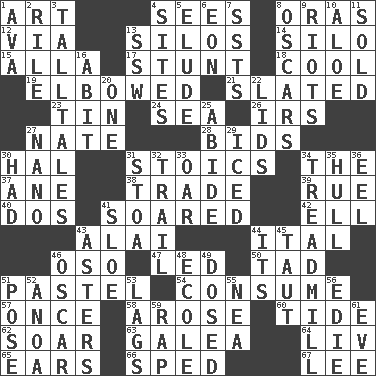 ACROSS 1. Tate display 4. Observes 8. Mouths or openings 12. By way of 13. Grain storage towers 14. Grain storage tower 15. Silent film actress Nazimova 17. Difficult or unusual or dangerous feat 18. Calm and collected 19. Turned at an angle; bent 21. Scheduled 23. Metal container 24. Ocean 26. Big collection agency 27. Nathan's nickname 28. Auction offers 30. Actor Linden 31. Unemotional ones 34. Definite Article 37. A saturated hydrocarbon 38. Exchange 39. Sorrow 40. Two (Sp.) 41. Flew 42. Pipe bend 43. Jai ____ 44. Slanted text style (abbr.) 46. Bear (Spanish) 47. Directed 50. Bit 51. Soft color 54. Ingest 57. At one time in the past 58. Came up 60. Event that recurs at intervals 62. Fly high 63. An organ shaped like a helmet 64. 54 in ancient Rome 65. Hearing organs 66. Broke a traffic law 67. Area sheltered from the wind DOWN 1. Actress Gardner 2. Cause heat under the collar 3. Baron Munchausen's specialties 4. Settings 5. Evade 6. Period of immesurable duration 7. Fast planes 8. Motion picture awards 9. Debaucheries 10. _ vera 11. Exchanged or delivered for money 13. Compass dir. 16. "This won't hurt ____!" 20. Single 22. Flaplike coverings 25. Stay 27. Billionth: prefix 29. On the rocks 30. Possessed 31. Portico 32. Hang back 33. Rowing implement 34. Excercise machine 35. Frame or body of a ship 36. Snakelike fish 41. A type of plum 43. Michaelmas daisies 44. It is 45. Pulled tight 46. Witty Wilde 48. Learning spot: Fr. 49. Administered medicine 51. Introduce or present, as a question 52. Small Philippine buffalo 53. Falls behind 55. Teachers' org. 56. Singer Brickell 59. Strike 61. Night before a holiday