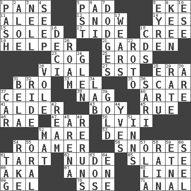 ACROSS 1. Baking dishes 5. Writing tablet 8. Supplement with great effort 11. Toward shelter 12. Frozen precipitation 14. Consenting reply 15. Having a sole or soles 17. Event that recurs at intervals 18. Algonquian 19. Assistant 21. Place where plants grow 23. Gear tooth 25. Greek god of love 26. Small bottle 27. Fast jet (abbr.) 28. Period 31. Sis' sibling 33. Cartoonist voice _ Blanc 35. Witty Wilde 37. To provide with a ceiling 38. Tired old horse 40. Johnson of "Laugh-In" 41. Tree or shrub in the Birch family 43. Male child 45. Regret 46. Actress Charlotte 47. Hearing organ 50. 57 in ancient Rome 52. Female horse 53. Lair 54. Nomad 56. Sounds asleep 61. Small pie 62. Unadorned 65. Schedule 66. Alias (abbr.) 67. At once, immediately (arch.) 68. Actor's bit 69. Set 70. Compass dir. 71. Of or related to the anus DOWN 1. Romantic infatuation 2. _ vera 3. 1994 drama film starring Jodie Foster 4. Ooze 5. Pacific Standard Time (abbr.) 6. Black tropical American cuckoo 7. Evades 8. Jane of fiction 9. Peachy ____! 10. Compass dir. 13. Puts on (as clothing) 16. Tenth: prefix 18. Music discs 20. Wander 22. Printing process, for short 24. Small, secluded valley 26. Short-tailed, large-bodied rat 28. Shade of tan 29. Pace 30. "We ___ not amused" (Victoria) 31. Actor Lugosi 32. Travel on or in a vehicle 34. Experiment locale 36. Indian skirt 37. 4-wheeled motor vehicle 39. Precious metal 42. 480, 500 or 516 sheets of paper 44. Jacques Cousteau's middle name 48. Sports stadium 49. Summer TV shows 51. Lodging establishments 52. Floor protector 54. Libertine 55. Of the mouth 57. Spanish pot 58. Water falling in drops from the sky 59. Inactive volcano in Sicily 60. Sew up the eyelids of hawks and falcons 61. Label 63. Two (Sp.) 64. Compass dir.