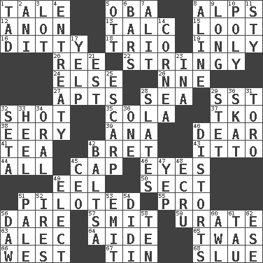 ACROSS 1. Falsehood 5. Chief or king in Benin or Nigeria 8. High mountains 12. Soon (poet.) 13. Baby powder 15. Spoils 16. Short, simple song 18. Musical group of three 19. In an inward manner 20. To separate or throw off 22. Slender, wiry 24. Otherwise 26. Compass dir. 27. Flats, for short 28. Ocean 29. Fast jet (abbr.) 32. Opportunity 35. Root beer relative 37. Ring climax 38. Suggestive of the supernatural 39. Santa ___, CA 40. Letter starter 41. Afternoon social gathering 42. Cy Young winner Saberhagen 43. "Tell ____ the Marines!" 44. Everything 45. Head covering 46. Snake ____ (dice throw) 49. Snakelike fish 50. Religious group 51. Manned the helm 55. Adept person 56. Have the gumption 57. Stricken, poetically 59. A salt of uric acid 63. Actor Baldwin 64. Assistant 65. It was, poetically 66. 270 degrees 67. Metal container 68. Turn sharply DOWN 1. Small boy 2. Cuckoo 3. Car dealer's back yard 4. Plea 5. Baseball player Mel 6. Long, evenly shaped pieces 7. Came down and settled, as after flight 8. Place in a line 9. Protracted 10. Much (prefix) 11. Filthy place 14. Pupil covering 17. Sharp bark 21. Eastern Standard Time (abbr.) 23. _ tizzy (2 wds.) 25. Fortification 28. Chalkboards 29. Proofreading order 30. Three-handed card game 31. "Corrida" creature 32. Stalk of a moss capsule 33. Person who is morally reprehensible 34. Of the mouth 36. Single 40. What propaganda does 42. Greek mezzo-soprano Agnes 45. Corporate head (abbr.) 47. Slangy assent 48. Shade of tan 49. Opt 51. Diluted with white 52. Angers 53. Give off 54. "You Light Up My Life" star Conn 56. Fool 58. Nine, plus one 60. Leather borer 61. The 19th letter of the Greek alphabet 62. Compass dir.