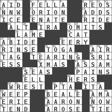 ACROSS 1. Assist 4. Man or boy (slang) 9. Vintage cars 13. Compass dir. 14. Greek mythologigal hunter 15. Sums up 16. Frozen water 17. Maternal 18. Travel on an animal 19. Keyboard modifier key 21. Retirement account (abbr.) 22. Leaves out 24. Unable to walk 26. Feline 27. Stay 29. Suggestive of the supernatural 30. Wash lightly 31. Ancient Roman robe 33. Wind 36. Label 37. Pulling into pieces 40. Indian title of respect (Mr.) 41. Curvy letter 42. Dec. holiday 43. Indian state 45. Oceans 47. Aches 48. Pipe bend 49. Possessive pronoun 50. Obtain by seizing forcibly or violently 52. Parent Teacher Assoc. 54. Call ___ day 56. Shed a tear 57. Calif. Air Force Base 59. Wet nurse (var.) 61. One of the Great Lakes 62. Composer Copland 63. Immediately 64. Watch over 65. Came up 66. Make a knot DOWN 1. Black tropical American cuckoo 2. South American Indian 3. Homes 4. Enemy 5. Bert's buddy 6. One who doesn't tell the truth 7. Globular water bottle used in Asia 8. One (Scot) 9. Noteworthy scarcity 10. Prepare for publication 11. Likelihood 12. Compass dir. 20. Small boys 22. Sea 23. Impair 25. Rendezvous 27. Johnson of "Laugh-In" 28. Prejudice 29. The front part of a cuirass 31. Scottish caps 32. Mouth or opening 33. Aide 34. SW Asia republic 35. Basketball hoops 38. Honor 39. Yawn 44. Indian skirt 45. Oozed 46. Raised railways 49. Saint headwear 50. Past tense of be (plural) 51. It's straight from the horse's mouth 52. Lightbulb-shaped fruit 53. Edible starchy tuberous root 55. Mine, in Marseilles 56. Soggy 57. Sound made by sheep 58. Compass dir. 60. Deep reverence