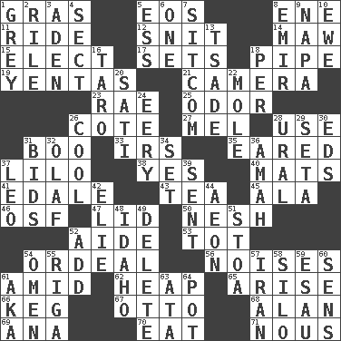 ACROSS 1. Pate de foie ____ 5. Greek goddess of the dawn 8. Compass dir. 11. Travel on an animal 12. In a ____ (agitated or irritated) 14. Informal term for the mouth 15. Opt 17. Puts into a specified state 18. Corncob 19. Gossips 21. Device for capturing images 23. Actress Charlotte 25. Aroma 26. ____ d'Azur (French Riviera) 27. Cartoonist voice _ Blanc 28. Purpose 31. Surprise greeting 33. Big collection agency 35. Having ears or earlike features 37. _ and Stitch 38. It is so 40. Floor protectors 41. Peak District village in England 43. Afternoon social gathering 45. According to 46. Order of Saint Francis (abbr.) 47. Flaplike covering 50. Soft 52. Helper 53. Small child 54. Severe or trying experience 56. Annoying sounds 61. Among 62. Pile 65. Originate 66. Cask 67. Von Bismarck 68. ____ Jay Lerner 69. Santa ___, CA 70. Consume 71. Common sense DOWN 1. Jennifer or Joel 2. Cause heat under the collar 3. Arabian gulf 4. Religious group 5. Curvy letter 6. Single 7. "Cheers" or "Ellen" 8. Independent ruler or chieftain 9. California wine valley 10. She-sheep 13. Sadhe (variant) 16. Edible starchy tuberous root 18. For each 20. Suttee (variant) 22. Undercover agent 24. Suggestive of the supernatural 26. Calm and collected 28. Mountain range 29. Bristle 30. Begley and Asner 31. Auction offers 32. Norwegian king 34. Arrange properly for use 36. Wet nurse 37. Lion 39. Emitted 42. Writer Wiesel 44. A really long time 48. Potato state 49. Keyboard key 51. Portico 52. Say or write further 54. Sign of something about to happen 55. Port city in Latvia 57. SW Asia republic 58. Grain storage tower 59. He sold his birthright 60. Elected reps. 61. Alias (abbr.) 63. _ moment's notice (2 wds.) 64. Cooking vessel