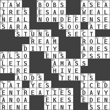 ACROSS 1. The 23rd letter of the Hebrew alphabet 4. Moves up and down 8. Toward the sea 12. Angers 14. He sold his birthright 15. Welt 16. Actress Patricia 17. Unrelated to defense, as in spending 20. "Two Mules for Sister ____" 21. "Barney Miller" actor Jack 22. Had dinner 23. Feeling sharp psychological pain 27. Religious group 29. 480, 500 or 516 sheets of paper 31. Hero or heavy, e.g. 34. Simple song 35. Ancient Greek god of war 36. In addition 39. Followers of ems 41. Inconspicuous attention getter 42. Allows 43. Collect or gather 46. Become fatigued 47. Hub of activity 48. Does sums 51. Portable shelters 54. Make lace 56. Affirmative reply 58. On the rocks 61. Pleas 66. American folk hero Crockett 67. Small Philippine buffalo 68. Makes supply last 69. Paradise 70. French philosopher Descartes 71. Portable shelter 72. Compass dir. DOWN 1. Airtight sealed metal containers 2. Type of rug 3. Puts on (as clothing) 4. Benjamin's nick name 5. Bear (Spanish) 6. Forbid 7. Soap bubbles 8. Deep reverence 9. Legislators 10. Compass direction 11. Toward shelter 13. Narrow board 18. Greek goddess of the dawn 19. Enemy 24. RI univ. 25. Remaining after all deductions 26. Yard entry 28. Dice game 30. Non-adult bird? 32. French article 33. Eastern Standard Time (abbr.) 34. Administered medicine 36. Keyboard modifier key 37. Flowery wreath 38. Ski resort town in Vermont 40. Stricken, poetically 44. "___ Maria" 45. Elected rep. 49. Color 50. Ocean 52. Periodic rise and fall of the sea level 53. Heaps 54. Lacerate 55. Singer Murray 57. Proofreading order 59. Nights before holidays 60. Unit of force 62. Actress Charlotte 63. Eisenhower's nickname 64. Car or cant ending 65. Fast jet (abbr.)