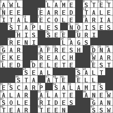 ACROSS 1. Leather borer 4. Unable to walk 8. Proofreading order 12. Born 13. Having ears or earlike features 14. Falsehood 15. Slanted text style (abbr.) 17. Learning spot: Fr. 18. Roberta Peters solo 19. Paper fasteners 21. Annoying sounds 23. Part of HMS, perhaps 24. Observe 26. RI univ. 27. Painter Guido (1575-1642) 28. Fails to keep up a pace 30. Slender fish 31. Anew 34. Heredity factor (abbr.) 37. Make supply last 38. Arrive at 39. Armed conflict 40. Directed 41. Erase 42. Eastern Standard Time (abbr.) 43. Lick closed 44. Table seasoning 46. R.R. building 47. Had dinner 50. Pipe bend 51. Fortification 54. Deli grouping 57. Having or resembling wings 58. Having winglike extensions 60. Afresh 62. Flatfish 63. Amusement-park features 64. Separate the seeds from cotton 65. Pull into pieces 66. Adolescent 67. Compass dir. DOWN 1. Cuckoo 2. Moistens 3. Resembling or made to resemble leather 4. Shoestrings 5. Came up 6. Cartoonist voice _ Blanc 7. Locale of original sin 8. Flight of steps 9. Tarsus (plural) 10. Writer Wiesel 11. Beverages made from leaves 13. Snakelike fish 16. (Had) reclined 20. Air pressure measure (abbr.) 22. Ending for "Through" and "Enough" 25. Opt 27. Libertine 29. American tennis player Robert 30. Set 31. Length times width 32. Chap (slang) 33. Actress Charlotte 34. Homes 35. Political cartoonist Thomas 36. Nonscientific branch of learning 41. Letter starter 43. A viewer who gazes fixedly 44. Ocean 45. _ mater 46. Any of the three canals of the cochlea 48. Sadhe (variant) 49. Ingested 51. 90 degrees 52. A type of plum 53. Component 55. French article 56. Oceans 59. Untruth 61. Compass dir.
