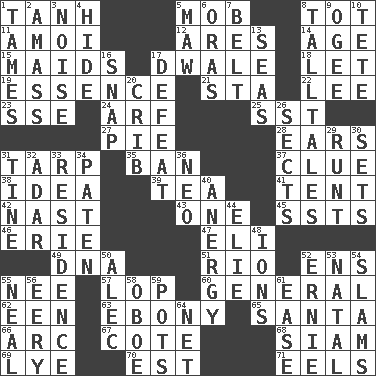 ACROSS 1. Hyperbolic tangent 5. Disorderly crowd 8. Small child 11. Mine, in Marseilles 12. Ancient Greek god of war 14. Personal question 15. Women servants 17. A sleeping potion; an opiate (poet.) 18. Allow 19. Gist 21. R.R. building 22. Area sheltered from the wind 23. Compass dir. 24. Sandy's bark 25. Fast jet (abbr.) 27. Sliced dessert 28. Hearing organs 31. Canvas cover 35. Forbid 37. A slight indication 38. The main thing one is thinking about 39. Beverage made from leaves 41. Portable shelter 42. Political cartoonist Thomas 43. Single 45. Fast planes 46. 4th largest of the Great Lakes 47. Connecticut Ivy Leaguer 49. Heredity factor (abbr.) 51. River (Sp.) 52. Followers of ems 55. Born 57. Trim (branches) 60. Commissioned military rank 62. Car or cant ending 63. Black 65. Before Barbara or Clara 66. Curve 67. ____ d'Azur (French Riviera) 68. Thailand, formerly 69. Potassium hydroxide 70. Eastern Standard Time (abbr.) 71. Snakelike fish DOWN 1. Corrects by punishment or discipline 2. Collect or gather 3. Annoying sound 4. Flintstone garb 5. Informal term for the mouth 6. Mouths or openings 7. Waist strap 8. Baron Munchausen's specialties 9. Double curve, resembling the letter S 10. False hair 13. Oceans 16. Fastener 17. Outscore 20. Baby bed with high sides 26. Religious groups 29. Undersized animal 30. Arranges properly for use 31. Prong on a fork 32. The sixth month of the Jewish calendar 33. Dwelling 34. Eucharist need 36. Modern: prefix 40. Disorder of the immune system 44. Writer Wiesel 48. Charged atoms 50. Actor Baldwin 52. Bert's buddy 53. Brizilian seaport 54. Criticizes harshly 55. Anneal 56. Suggestive of the supernatural 58. Mitch Miller's instrument 59. Plant holders 61. Relaxation 64. Fish or hair follower