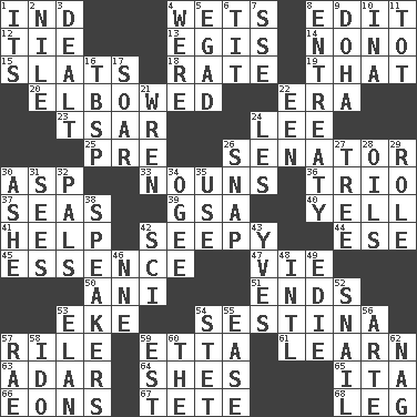 ACROSS 1. Indiana (abbr.) 4. Moistens 8. Prepare for publication 12. Neckwear 13. Armor plate that protects the chest 14. Words to Nanette 15. Narrow boards 18. Assign a rank or rating to 19. Not this but _ 20. Turned at an angle; bent 22. Period 23. Russian ruler of old 24. Area sheltered from the wind 25. Before (prefix) 26. Elected representative 30. Cleo's killer 33. Parts of speech 36. Musical group of three 37. Oceans 39. Girls' org. (abbr.) 40. Shout 41. Assist 42. Oozy 44. Compass dir. 45. Gist 47. Compete 50. Cuckoo 51. Conclusions 53. Make supply last 54. French poetic form 57. Cause heat under the collar 59. Singer James 61. Acquire or gain knowledge or skills 63. The sixth month of the Jewish calendar 64. "______ My Girl" (Turtles hit) 65. Call ___ day 66. Immeasurably long periods of time 67. False hair 68. Part of a journey DOWN 1. It is 2. The longest river in the world 3. Started a card game 4. We are 5. Mild oath 6. Teat (slang) 7. Compass dir. 8. Plea 9. Capital of the state of Qatar 10. _ tizzy (2 wds.) 11. Small child 16. Cook's measure (abbr.) 17. Fly high 21. Songbird 22. Car or cant ending 24. French article 26. Fastener 27. Woody plant 28. Petroleums 29. Hero or heavy, e.g. 30. American tennis player Robert 31. Observes 32. Friends 34. Double curve, resembling the letter S 35. Purpose 38. Orators 42. _-fi 43. Jacques Cousteau's middle name 46. Compass dir. 48. International (abbr.) 49. Singer Brickell 52. Slow-paced one 53. Enthusiasm 54. Proofreading order 55. Relaxation 56. Johnson of "Laugh-In" 57. Actress Charlotte 58. Wedding promise 59. Eastern Standard Time (abbr.) 60. Definite Article 62. Tired old horse