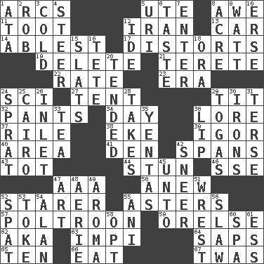 ACROSS 1. Arches 5. Shoshoni 8. Deep reverence 11. A blast of a horn 12. SW Asia republic 13. Auto 14. Most capable 17. What propaganda does 19. Erase 21. Cigar-shaped 22. Assign a rank or rating to 23. Epoch 24. _-fi 27. Portable shelter 29. Teat (slang) 32. Leg coverings 34. 24 hours 36. Old wives' tales, e.g. 37. Cause heat under the collar 38. Supplement with great effort 39. Composer Stravinsky 40. Type of rug 41. Lair 42. Connects, as a bridge 43. Small child 44. Make senseless or dizzy 46. Compass dir. 47. American Automobile Association (abbr.) 50. Afresh 52. A viewer who gazes fixedly 55. Michaelmas daisies 57. Characterized by complete cowardliness 59. Threatening words 62. Alias (abbr.) 63. Body of Kaffir warriors 64. Plant excrements 65. Nine, plus one 66. Erode 67. It was, poetically DOWN 1. _ moment's notice (2 wds.) 2. Director Reiner 3. Having a low temperature 4. Guide 5. RI univ. 6. Clothes sense 7. Keyboard key 8. 43,560 square feet 9. Electrical Unit 10. Celtic language 12. Binary compound 15. Narrow boards 16. False hair 18. Mouth or opening 20. Watched over 24. Small fatty European fish 25. Capital of Egypt 26. An arm off of a larger body of water 28. Receives possession of 29. Ancient Roman robes 30. Removes the wrinkles 31. Laconic 33. Afternoon social gathering 35. Gossips 36. Mouth edge 42. Scornful expression 45. To (old English) 47. Tate display 48. Nest on high 49. Odor 51. Obtain by seizing forcibly or violently 52. Petty quarrel 53. Puff or smoke 54. Actor Alda or Thicke 55. Black tropical American cuckoo 56. Cole _ (cabbage dish) 58. Elect 60. Health resort 61. Double-curved letter