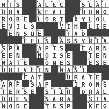 ACROSS 1. Mountains (abbr.) 4. Actor Baldwin 8. Narrow board 12. Mouth or opening 13. Welt 14. Same (prefix) 15. Loose flowing garment 17. Australian parrot (variant) 18. Xylene (variant) 19. Vices 21. Zeal 23. Whopper 24. Follow as a consequence or result 26. Small boy 28. Snakelike fish 30. Nineveh was its capital 34. Health resort 37. Flats, for short 39. Merit 40. Car or cant ending 41. Annoying sound 43. "___ Little Indians" 44. Nathan's nickname 46. Washington bills 47. Compass dir. 48. Popular '50s hangout 51. Political cartoonist Thomas 54. Erode 55. A salt of uric acid 58. Sandy's bark 61. Plant excrement 63. Removes the wrinkles 65. Laconic 67. Agitate 71. Spoken 72. Lyric poems 73. "Two Mules for Sister ____" 74. R.R. building 75. Method 76. Cook's measure (abbr.) 77. Barrel DOWN 1. Greater amount 2. Collection of objects 3. Unit of acoustic absorption 4. Leather borer 5. Lion 6. Ewer handle 7. 154 in Roman numerals 8. Like a shrinking violet 9. Hang loosely or laxly 10. Mine, in Marseilles 11. Lacquered or enameled metalware 16. Otherwise 18. Dec. holiday 20. Take to court 22. It is 25. Style 27. Color 29. Soup utensil 30. NE Netherlands city 31. Pace 32. Angers 33. Queen of England 1702-14 34. Post 35. Lightbulb-shaped fruit 36. Opposed to 38. Metal container 42. He sold his birthright 45. First lady 49. Comfort 50. Call ___ day 52. _ Lanka 53. Edible starchy tuberous root 56. Cod relative 57. Related on the mother's side 58. Smallest unit of an element 59. Do over again 60. Flintstone 62. Inconspicuous attention getter 64. Volcanic refuse 66. Compass dir. 68. Bar bill 69. Big collection agency 70. Strike