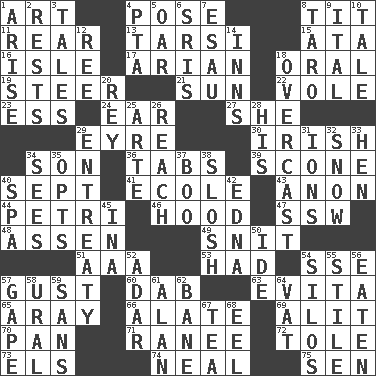 ACROSS 1. Nonscientific branch of learning 4. Introduce or present, as a question 8. Teat (slang) 11. Stern 13. Tarsus (plural) 15. _ moment's notice (2 wds.) 16. Capri or Wight 17. Believer in; advocate of (suffix) 18. Spoken 19. Navigate 21. Player for Phoenix 22. Grand slam 23. Double-curved letter 24. Hearing organ 27. A female animal or person 29. Jane of fiction 30. From or relating to Ireland 34. Manchild 36. Bar bills 39. Biscuitlike quick bread 40. Back-to-school mo. 41. Learning spot: Fr. 43. At once, immediately (arch.) 44. _ dish (used to culture cells) 46. Parka part 47. Compass dir. 48. NE Netherlands city 49. In a ____ (agitated or irritated) 51. American Automobile Association (abbr.) 53. Possessed 54. Compass dir. 57. Abrupt rush of wind 60. Apply (a substance) by light strokes 63. Webber/Rice musical 65. Like ___ of sunshine 66. Having winglike extensions 69. Came down and settled, as after flight 70. Baking dish 71. The wife of a rajah (variant) 72. Lacquered or enameled metalware 73. Raised railways 74. Be tempered by heat 75. Elected rep. DOWN 1. Get up 2. Musical pauses 3. Lies 4. Parent Teacher Assoc. 5. Rowing implement 6. Indian titles of respect 7. He sold his birthright 8. Edible starchy tuberous root 9. Slanted text style (abbr.) 10. Lie 12. To separate or throw off 14. Taverns 18. Cloudy 20. Marina Del _, California 25. Johnson of "Laugh-In" 26. Arrive at 28. Part of HMS, perhaps 29. Plea 31. Charged atoms 32. Overwhelm 33. Layer 34. Observes 35. Chooses 37. Oct. 31 cry 38. Make a splashing sound 40. Health resort 42. Pulitzer Prize-winning author Ferber 45. _ tizzy (2 wds.) 50. Binary compound 52. The sixth month of the Jewish calendar 54. Grain storage towers 55. Vertical member of a panel or frame 56. Consumed 57. Yawn 58. Mountain range 59. Without 61. ____ Jay Lerner 62. Object of repulsion 64. Large container 67. Beverage made from leaves 68. Snakelike fish