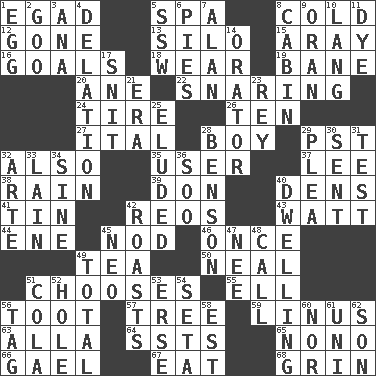 ACROSS 1. Mild oath 5. Health resort 8. Chilled 12. Went 13. Grain storage tower 15. Like ___ of sunshine 16. Finish lines 18. Put on (as clothing) 19. Object of repulsion 20. A saturated hydrocarbon 22. Catching in a trap 24. Become fatigued 26. Nine, plus one 27. Slanted text style (abbr.) 28. Male child 29. Pacific Standard Time (abbr.) 32. In addition 35. One who makes use of a thing 37. Area sheltered from the wind 38. Water falling in drops from the sky 39. Spanish title 40. Lairs 41. Shallow baking pan 42. Vintage cars 43. Electrical Unit 44. Compass dir. 45. Lower and raise head in agreement 46. Single time 49. Afternoon social gathering 50. Anneal 51. Elects 55. Pipe bend 56. A blast of a horn 57. Family _ (genealogy) 59. "_ and Lucy" (Charlie Brown theme song) 63. Silent film actress Nazimova 64. Fast planes 65. Words to Nanette 66. Highlander 67. Erode 68. Amused look DOWN 1. Ovum 2. Thick or sticky substance 3. Santa ___, CA 4. Conveyance 5. Compass dir. 6. Sliced desserts 7. ____ Jay Lerner 8. Small house or cottage 9. Northwest Algerian city 10. Long (Scottish) 11. Color 14. Speaker 17. In a ____ (agitated or irritated) 21. Epoch 23. Marina Del _, California 25. Evaded 28. Gillaume's butler role 29. Entreaty 30. Transmitted 31. Trial 32. Johnson of "Laugh-In" 33. (Had) reclined 34. Trig term 36. "Barney Miller" actor Jack 40. Home 42. Exposes to great heat 45. Modern: prefix 47. Born 48. Give a ring to 49. "_____ Recall" 51. Root beer relative 52. Opening into or through something 53. Celtic language 54. Stalk of a moss capsule 56. Label 58. Eastern Standard Time (abbr.) 60. Not either 61. Corn or form start 62. Male offspring