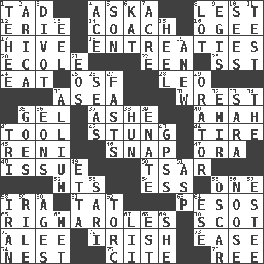 ACROSS 1. Small boy 4. "____ silly question..." 8. For fear that 12. One of the Great Lakes 14. Team commander 16. Double curve, resembling the letter S 17. Hub of activity 18. Pleas 20. Learning spot: Fr. 22. Car or cant ending 23. Fast jet (abbr.) 24. Consume 25. Order of Saint Francis (abbr.) 28. Lion 30. At sea 31. Take or capture by force 35. Set 37. American tennis player Robert 40. Nanny 41. Implement 42. Feeling sharp psychological pain 44. Hoop that covers a wheel 45. Painter Guido (1575-1642) 46. Fastener 47. Mouth or opening 48. Come out of 50. Russian ruler of old 52. Mountains (abbr.) 54. Double-curved letter 55. Single 58. Retirement account (abbr.) 61. Make lace 63. Mexican monetary units 65. Frustrating wastes of time 70. Highlander 71. Toward shelter 72. From or relating to Ireland 73. Relaxation 74. A home for chicks 75. Quote 76. To separate or throw off DOWN 1. Giggle 2. N. Chile seaport 3. A piece of turf (Scot.) 4. Adept person 5. Male offspring 6. Krazy ___ of comics 7. 1/640 square mile 8. Car dealer's back yard 9. The front part of a cuirass 10. Observes 11. Trial 13. Snakelike fish 15. Person who is morally reprehensible 19. Afresh 21. Greek goddess of the dawn 26. Oceans 27. Goes without food and/or water 29. Speaker 30. Plant genus of onion and garlic 32. Independent ruler or chieftain 33. "Two Mules for Sister ____" 34. Definite Article 35. Leaves 36. Immeasurably long periods of time 38. Attila the _ 39. Maternal 41. Three (prefix) 43. Global Positioning Systems (abbr.) 49. Singer James 51. Viper 53. Indian skirt 55. Witty Wilde 56. Trap for birds or small mammals 57. First name in cosmetics 58. SW Asia republic 59. Cause heat under the collar 60. Ripens 62. Torque (variant) 64. Compass dir. 66. Was introduced to 67. Cards in a Roman deck? 68. Eastern Standard Time (abbr.) 69. A female animal or person