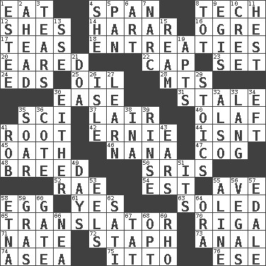 ACROSS 1. Erode 4. Connect, as a bridge 8. Technology 12. "______ My Girl" (Turtles hit) 14. Ethiopian city, capital of Harari 16. Legendary monster 17. Afternoon social gatherings 18. Pleas 20. Having ears or earlike features 22. Head covering 23. Arrange properly for use 24. Begley and Asner 25. Lubricate 28. Mountains (abbr.) 30. Relaxation 31. Showing deterioration from age 35. _-fi 37. Den 40. Norwegian king 41. Carrot, for example 42. Bert's buddy 44. Is not 45. Pledge 46. Nanny 47. Gear tooth 48. A special lineage 50. Indian titles of respect 52. Actress Charlotte 54. Eastern Standard Time (abbr.) 55. "___ Maria" 58. Ovum 61. It is so 63. Having a sole or soles 65. Interpreter 70. Capital of Latvia 71. Nathan's nickname 72. Staphylococcus 73. Of or related to the anus 74. Toward the sea 75. "Tell ____ the Marines!" 76. Compass dir. DOWN 1. First name in cosmetics 2. Having the leading position 3. Pulls apart 4. A female animal or person 5. Baking dish 6. Nonscientific branch of learning 7. Drug cop 8. Small child 9. The front part of a cuirass 10. Algonquian 11. Behest 13. Compass dir. 15. 480, 500 or 516 sheets of paper 19. Tenement units (abbr.) 21. ___ good deed 26. Small island 27. Memorize 29. Unemotional ones 30. One or the other 32. In addition 33. Austrian-born American filmmaker Fritz 34. Lizard (obsolete) 35. Fly high 36. ____ d'Azur (French Riviera) 38. _ tizzy (2 wds.) 39. Remove soap 41. Director Reiner 43. Hearing organs 49. 24-hour periods 51. ___ a Wonderful Life 53. Snakelike fish 55. Place in a line 56. Viva Las _ 57. Peak District village in England 58. Inactive volcano in Sicily 59. Pate de foie ____ 60. Yard entry 62. Suttee (variant) 64. Mouth or opening 66. Teachers' org. 67. Make lace 68. Elect 69. 17th letter of the Greek alphabet