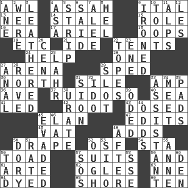 ACROSS 1. Leather borer 4. Indian state 9. Slanted text style (abbr.) 13. Born 14. Lacking originality or spontaneity 15. Hero or heavy, e.g. 16. Epoch 17. Satellite of Uranus 18. I made a mistake 19. And so on (abbr.) 21. Binary compound 22. Portable shelters 24. Assist 26. Single 27. Sports stadium 29. Moved rapidly 30. Compass direction 31. Drop; flow; fall 33. Electrical Unit 36. "___ Maria" 37. Noisy, rowdy, vocal (Spanish) 40. Ocean 41. Directed 42. Carrot, for example 43. Administered medicine 45. Style 47. Prepares for publication 48. Large container 49. Does sums 50. Window treatment 52. Order of Saint Francis (abbr.) 54. R.R. building 56. Frog relative 57. Sets of matching outer garments 59. Added to 61. Johnson of "Laugh-In" 62. Stares at amorously 63. Compass dir. 64. Colored 65. Dinah or Pauly 66. "___ Little Indians" DOWN 1. A saturated hydrocarbon 2. Past tense of be (plural) 3. Resembling or made to resemble leather 4. White ___ sheet 5. Long narrow piece of something 6. Alleged 7. Toward shelter 8. Cartoonist voice _ Blanc 9. Pressed 10. A blast of a horn 11. High mountains 12. French article 20. Penny 22. Drinks excessively 23. Compass dir. 25. Cowardly lion portrayer 27. Of or related to the anus 28. Be footloose 29. Notch 31. The Jewish people; Israel 32. Wedding promise 33. Helper 34. Confront 35. Writing tablets 38. A salt of uric acid 39. Wrote a lyric poem 44. Probability 45. Eluded 46. Infant locale 49. Following 50. Rowboat 51. Assign a rank or rating to 52. Ending for "Through" and "Enough" 53. Grain storage tower 55. Queen of England 1702-14 56. Small amount or degree 57. Mayday 58. Compass dir. 60. Lair