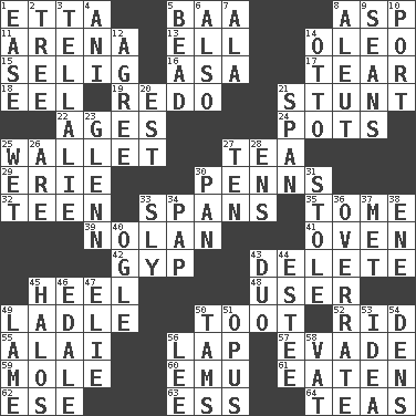 ACROSS 1. Singer James 5. Sound made by sheep 8. Viper 11. Sports stadium 13. Pipe bend 14. Margarine 15. Major League Baseball Commissioner Bud 16. White ___ sheet 17. Rend 18. Snakelike fish 19. Make new 21. Difficult or unusual or dangerous feat 22. Ripens 24. Plant holders 25. Place for singles 27. Beverage made from leaves 29. 4th largest of the Great Lakes 30. Actor Sean's family 32. Adolescent 33. Connects, as a bridge 35. Heavy book 39. Pitcher Ryan 41. Baking chamber 42. Con 43. Keyboard key 45. Person who is morally reprehensible 48. One who uses or employs something 49. Dipping utensil 50. A blast of a horn 52. To free from 55. Jai _ 56. Infant locale 57. Dodge 59. Undercover agent 60. Australian flightless bird 61. Eroded 62. Compass dir. 63. Double-curved letter 64. Beverages made from leaves DOWN 1. Relaxation 2. Woody plant 3. Copy Pinocchio 4. Black tropical American cuckoo 5. Necklace unit 6. In addition 7. In the manner of 8. Native American of Southwest Alaska 9. Actors Connery and Penn 10. Sweet dark-red dessert wine 12. Match 14. Von Bismarck 20. Eastern Standard Time (abbr.) 21. Connect, as a bridge 23. American astronaut and politician John 25. Soggy 26. "We ___ not amused" (Victoria) 27. "___ Little Indians" 28. Followers of ems 30. Baking dish 31. Fur scarf 33. Playfully artful 34. Infant food 36. Make much ado about nothing 37. Was introduced to 38. Compass dir. 40. Stare 43. Superhero pair 44. First name in cosmetics 45. Radiant circles of light 46. Peak District village in England 47. Writer Wiesel 49. Unable to walk 50. Scottish caps 51. Musical composition 53. The content of cognition 54. Hiding places for outlaws 56. Area sheltered from the wind 58. Large container