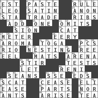 ACROSS 1. Eastern Standard Time (abbr.) 4. Thick mixture 9. Governing power 13. Lion 14. Smooth fabric 15. Soon (poet.) 16. R.R. building 17. Barter 18. Chest bones 19. Find the sum of 21. Single 22. Leaves out 24. The Jewish people; Israel 26. Domesticated feline 27. Distance measurement 29. Suggestive of the supernatural 30. Odor 31. Ancient Roman robe 33. Personal Computers (abbr.) 36. River (Sp.) 37. Snuggling 40. To separate or throw off 41. Snakelike fish 42. Floor protectors 43. Sports stadium 45. Use a spoon 47. Trials 48. Allow 49. Painter Guido (1575-1642) 50. Actors Connery and Penn 52. Compass dir. 54. Begley and Asner 56. Leave at once 57. Desist 59. Biblical high priest 61. Comfort 62. Actors' quests 63. Not either 64. Pismires 65. Originate 66. Afternoon social gathering DOWN 1. Raised railways 2. Bristle 3. Inedible or poisonous agaric 4. Pacific Standard Time (abbr.) 5. Composer Copland 6. Comedian Laurel of Laurel & Hardy 7. Event that recurs at intervals 8. Compass dir. 9. Noteworthy scarcity 10. A single undivided whole 11. Tennis shots 12. Followers of ems 20. South Vietnam president (1954) 22. Sea 23. Make imperfect 25. NW Algerian seaport 27. Female horse 28. One of the Great Lakes 29. The front part of a cuirass 31. Russian ruler of old 32. Baseball player Mel 33. Elected leader of a country 34. Penny 35. Oceans 38. Gives off 39. Yard entry 44. French philosopher Descartes 45. Chalkboards 46. "___ Little Indians" 49. Musical pauses 50. Glance over 51. 90 degrees 52. Shrivel 53. Indian skirt 55. _ gin 56. Ocean 57. Accounting whiz (abbr.) 58. Compass dir. 60. Lyricist Gershwin