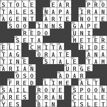 ACROSS 1. Took without asking 6. Hearing organ 9. Adept person 12. Lies 13. California wine valley 14. SW Asia republic 15. Representative 16. Johnson of "Laugh-In" 17. Brief written record 18. "Barney Miller" actor Jack 19. Restaurants 20. Open wide 21. Redecorate 23. Corn or form start 24. Stalk of a moss capsule 25. Distance measurement 28. Connecticut Ivy Leaguer 30. Riviera of "Kiss of the Spider Woman" 34. Travel on or in a vehicle 35. Label 36. Declaim 38. Santa ___, CA 39. Prong on a fork 41. Having lost freshness 43. Scottish cap 44. Believer in; advocate of (suffix) 46. Goad 48. Bear (Spanish) 49. The sixth month of the Jewish calendar 50. Flintstone 51. Citrus frut 53. The first octave above the treble staff 56. Travel by water 57. Be footloose 58. Soup utensil 60. Ancient Greek god of war 61. NW Algerian seaport 62. Cell (Danish) 63. Affirmative reply 64. Storage container 65. Small island DOWN 1. R.R. building 2. Labels 3. Butter sub 4. Poe poem 5. Eastern Standard Time (abbr.) 6. Merit 7. Flats, for short 8. Actress Charlotte 9. Appease 10. Assign a rank or rating to 11. Single 13. Billionth: prefix 14. Sillier 19. Potato state 20. Chewing product 22. And so on (abbr.) 24. Seigniories (variant) 26. Pulitzer Prize-winning author Ferber 27. 480, 500 or 516 sheets of paper 28. Singer James 29. Den 31. Big collection agency 32. Make lace 33. _ moment's notice (2 wds.) 37. Evade 40. Artist's stands 42. Period 45. Allow head to fall sleepily 47. Wine fruits 49. So be it 50. Conductor's collection 51. Australian parrot (variant) 52. "Terrible" tsar 54. Hang loosely or laxly 55. Lacquered or enameled metalware 56. Declare 57. Director Reiner 58. _-fi 59. Remaining after all deductions