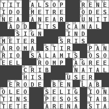 ACROSS 1. Teat (slang) 4. Columnist Joseph or Stewart 9. French philosopher Descartes 13. Wedding promise 14. Distance measurement (Brit.) 15. Lyric poems 16. Teachers' org. 17. Approach 18. A single undivided whole 19. Say or write further 21. ___ a Wonderful Life 22. Lessep's creation 24. Attach a signature 26. Indiana (abbr.) 27. Distance measurement 29. Indian titles of respect 30. Scent 31. Disorderly outburst 33. Baking dish 36. River (Sp.) 37. Deli grouping 40. Bear (Spanish) 41. Snakelike fish 42. Frolic 43. Match 45. Baby bed with high sides 47. Brizilian seaport 48. Part of HMS, perhaps 49. One who uses or employs something 50. Eat (away) 52. Benjamin's nick name 54. Experiment locale 56. Butter sub 57. Former Milwaukee Brewers owner Bud 59. Electrically charged atom 61. Canisters 62. Mexican monetary units 63. Bar bill 64. False hair 65. Sports stadium 66. R.R. building DOWN 1. Shallow baking pan 2. It may be bright or harebrained 3. Inedible or poisonous agaric 4. Nanny (var.) 5. Soviet premier 1918-24 6. Proofreading order 7. Mouths or openings 8. For each 9. Periods in a boxing match 10. Pulitzer Prize-winning author Ferber 11. Famous astronaut Armstrong 12. Eastern Standard Time (abbr.) 20. South Vietnam president (1954) 22. High-altitude cloud 23. Cuckoo 25. Pate de foie ____ 27. Female horse 28. One of the Great Lakes 29. Simple or foolish person 31. Messy guy 32. Scottish cap 33. Likenesses of persons 34. Toward the sea 35. Christmas carol 38. Originate 39. Without 44. Highlander 45. Elect 46. To free from 49. The state of being joined or united 50. Writer Wiesel 51. Monthly bill 52. Fermented drink made from hops 53. Otherwise 55. Water vessel 56. Baseball player Mel 57. Health resort 58. Girls' org. (abbr.) 60. Basketball assoc.
