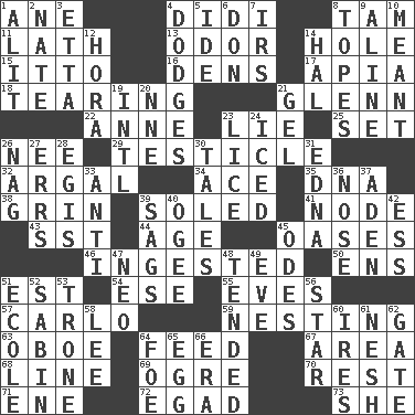 ACROSS 1. A saturated hydrocarbon 4. "You Light Up My Life" star Conn 8. Scottish cap 11. Thin strip of wood or metal 13. Aroma 14. Opening into or through something 15. "Tell ____ the Marines!" 16. Lairs 17. Capital of Western Samoa 18. Pulling into pieces 21. American astronaut and politician John 22. Queen of England 1702-14 23. Untruth 25. Put into a specified state 26. Born 29. One of the two male reproductive glands 32. Therefore, facetiously 34. Adept person 35. Heredity factor (abbr.) 38. Smile widely 39. Having a sole or soles 41. Connecting point 43. Fast jet (abbr.) 44. Mature 45. Fertile tracts in a desert 46. Eaten 50. Followers of ems 51. Eastern Standard Time (abbr.) 54. Compass dir. 55. Nights before holidays 57. Monte _, Las Vegas Hotel/Casino 59. Snuggling 63. Mitch Miller's instrument 64. Nourish 67. Type of rug 68. Actor's bit 69. Legendary monster 70. Relief 71. Compass dir. 72. Mild oath 73. A female animal or person DOWN 1. Came down and settled, as after flight 2. Nathan's nickname 3. Singer James 4. Evades 5. Binary compound 6. Spanish title 7. Big collection agency 8. Drinks excessively 9. Place in a line 10. Intended 12. Israeli folk dance 14. Actor Linden 19. International (abbr.) 20. Compass dir. 21. Set 23. Louse (plural) 24. On the rocks 26. Tired old horse 27. Blunders 28. The front part of a cuirass 30. Lies 31. Pulitzer Prize-winning author Ferber 33. Against 36. Olfactory organ 37. An important port of Yemen 39. Droops 40. Double curve, resembling the letter S 42. Curvy letter 45. Lyric poems 47. Modern: prefix 48. Looked after 49. Night before a holiday 51. Learning spot: Fr. 52. Unit of acoustic absorption 53. Heavy duty weighing machine 56. Play the lead 58. Area sheltered from the wind 60. Angers 61. Delicate 62. Yard entry 64. Enemy 65. Oval reproductive body of a fowl 66. Period