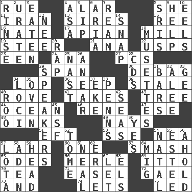 ACROSS 1. Sorrow 4. Having or resembling wings 8. A female animal or person 11. SW Asia republic 13. Male parents of animals 15. To separate or throw off 16. Nathan's nickname 17. Bee-related 18. Place where flour is made 19. Navigate 21. Nanny (var.) 22. United States Postal Service (abbr.) 23. Car or cant ending 24. Santa ___, CA 27. Personal Computers (abbr.) 29. Connect, as a bridge 30. Debunk (Brit. slang) 34. Trim (branches) 36. Ooze 39. Lacking originality or spontaneity 40. Be footloose 41. Receives possession of 43. Woody plant 44. Sea 46. French philosopher Descartes 47. Compass dir. 48. Pig sounds 49. Negative votes 51. Bank Draft (abbr.) 53. Compass dir. 54. Teachers' org. 57. Cowardly lion portrayer 60. Single 63. Box-office sellout 65. Lyric poems 66. Haggard of country music 69. "Tell ____ the Marines!" 70. Afternoon social gathering 71. Artist's stand 72. Highlander 73. Added to 74. Allows 75. Directed DOWN 1. Wash lightly 2. A salt of uric acid 3. Ingested 4. White ___ sheet 5. Mouth edge 6. Operatic vocal solo 7. 480, 500 or 516 sheets of paper 8. Indian titles of respect 9. Assist 10. Snakelike fish 12. Born 14. Fastener 18. French bagpipes 20. Strike 25. Political cartoonist Thomas 26. Approach 28. Music discs 29. Orators 31. Drinking establishments 32. Toward shelter 33. Turn to the right 34. Locales 35. Baking chamber 37. Supplement with great effort 38. Actor Sean's family 40. Friend of Pooh 42. Oceans 45. Science/research agcy. 50. Affirmative reply 52. Heavy book 54. Brizilian seaport 55. First name in cosmetics 56. Hold, grip (Informal) 57. Globular water bottle used in Asia 58. An important port of Yemen 59. Froth on beer 61. Anneal 62. Celtic language 64. Russian fighter aircraft 67. Allow 68. Raised railways
