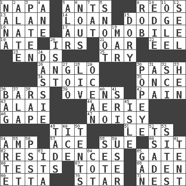 ACROSS 1. California wine valley 5. Pismires 9. Vintage cars 13. ____ Jay Lerner 14. Grant temporary use of 15. Evade 16. Nathan's nickname 17. Car 19. Had dinner 20. Big collection agency 21. Rowing implement 22. Snakelike fish 23. Extremities 25. Attempt 26. White American of non-Hispanic descent 30. Romantic infatuation 34. Unemotional 35. Single time 36. Oblong pieces of solid material 39. Baking chambers 42. Ache 43. Jai _ 44. Nest on high 46. Yawn 47. Annoyingly loud 48. Teat (slang) 51. Allows 54. Electrical Unit 57. Adept person 58. Take to court 60. Be seated 62. Dwellings 65. Yard entry 66. Trials 67. Lug 68. Arabian gulf 69. Singer James 70. Play the lead 71. A home for chicks DOWN 1. Grandmother 2. Having winglike extensions 3. Eucharist need 4. A saturated hydrocarbon 5. Having or resembling wings 6. Common sense 7. Make lace 8. Snout, nose 9. Director Reiner 10. Singer Brickell 11. Stare 12. Stitch closed the eyes of (a falcon) 15. Small, narrow, flatbottom fishing boat 18. Third mo. 20. Is not 24. Small ungulate mammals of Africa 27. Thick or sticky substance 28. 54 in ancient Rome 29. Sea 30. Wimpy's pal 31. Santa ___, CA 32. _-fi 33. Layer 36. Paper or plastic container 37. Wing 38. Reproach for some lapse or misdeed 40. Modern: prefix 41. Indian title of respect (Mr.) 45. Capri or Wight 48. Bits 49. Frozen water 50. Portable shelters 52. Sadhe (variant) 53. Settings 54. Johnson of "Laugh-In" 55. Confront 56. Inconspicuous attention getter 58. Bristle 59. One who makes use of a thing 61. Portable shelter 63. Call ___ day 64. Small bed 65. Separate the seeds from cotton