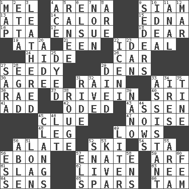 ACROSS 1. Cartoonist voice _ Blanc 4. Sports stadium 9. Thailand, formerly 13. Had dinner 14. Bodily heat indicating an inflammation 15. Pulitzer Prize-winning author Ferber 16. Parent Teacher Assoc. 17. Follow as a consequence or result 18. Letter starter 19. "One Day ___ Time" 21. Car or cant ending 22. Perfect 24. Flintstone garb 26. Automobile 27. Morally degraded 29. Hiding places for outlaws 30. Match 31. Water falling in drops from the sky 33. Small island 36. Actress Charlotte 37. Popular '50s hangout 40. _ Lanka 41. Say or write further 42. Wrote a lyric poem 43. NE Netherlands city 45. A slight indication 47. Annoying sound 48. Part of a journey 49. Moos 50. Having winglike extensions 52. What Jean-Claude Killy likes to do 54. R.R. building 56. Inky black, to poets 57. Related on the mother's side 59. Sandy's bark 61. Volcanic refuse 62. Make or become more lively 63. Born 64. Elected reps. 65. Practice fights 66. Scottish cap DOWN 1. Atlas unit 2. Singer James 3. Resembling or made to resemble leather 4. Adept person 5. The wife of a rajah (variant) 6. Otherwise 7. Part of speech 8. "We ___ not amused" (Victoria) 9. Spring feasts 10. It may be bright or harebrained 11. Of or related to the anus 12. Make imperfect 20. Assistant 22. Ancient Celtic tribe of eastern Britain 23. One of the 12 tribes of Israel 25. Colored 27. "Two Mules for Sister ____" 28. Mild oath 29. Passed on 31. Travel on or in a vehicle 32. "___ Maria" 33. Aide 34. Angers 35. Prong on a fork 38. Makeup applied to the cheeks 39. Billionth: prefix 44. Sty mamas 45. Rigngs loudly 46. Allow 49. 61 cubic inches 50. Competent 51. Grant temporary use of 52. Clip 53. Polynesian shrub of the pepper family 55. Length times width 56. Curvy letter 57. Raised railways 58. Followers of ems 60. Opposite of masc.