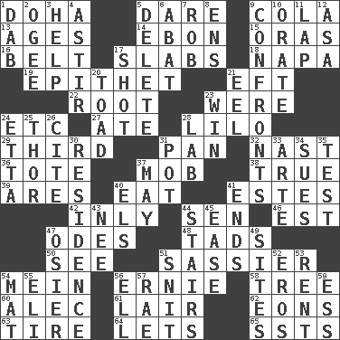 ACROSS 1. Capital of the state of Qatar 5. Have the gumption 9. Root beer relative 13. Matures 14. Inky black, to poets 15. Mouths or openings 16. Waist strap 17. Thick slices 18. California wine valley 19. Curse 21. Lizard (obsolete) 22. Carrot, for example 23. Past tense of be (plural) 24. And so on (abbr.) 27. Had dinner 28. _ and Stitch 29. One of three equal parts 31. Baking dish 32. Political cartoonist Thomas 36. Carryall 37. Crowd into 38. Loyal 39. Ancient Greek god of war 40. Ingest 41. _____ Park, CO 42. Inwardly 44. Elected rep. 46. Eastern Standard Time (abbr.) 47. Lyric poems 48. Bits 50. Perceive with the eye 51. More lively and spirited 54. Count _ (2 wds.) 56. Bert's buddy 58. Woody plant 60. Actor Baldwin 61. Den 62. Immeasurably long periods of time 63. Become fatigued 64. Allows 65. Fast planes DOWN 1. Apply (a substance) by light strokes 2. Double curve, resembling the letter S 3. Aid 4. Moving or stirring 5. Keyboard key 6. Blind as ____ 7. Director Reiner 8. Followers of ems 9. Meets 10. Speak pompously 11. Infant locale 12. White ___ sheet 17. Went for two points 20. Frog relative 21. Snakelike fish 23. Victory 24. Singer James 25. Son of Odin 26. Quote 28. Experiment locale 30. Home 31. Cooking vessel 33. Johnson of "Laugh-In" 34. Takes to court 35. Trial 37. Fifth month 40. Raised railways 41. Conclusions 43. Born 44. Flight of steps 45. Comfort 47. Flexible twig of a willow tree 49. Locates 51. In a ____ (agitated or irritated) 52. Greek god of love 53. Monthly bill 54. Floor covering 55. Biblical high priest 56. Pipe bend 57. Actress Charlotte 59. Curvy letter