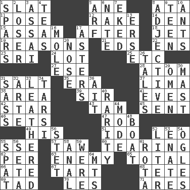 ACROSS 1. Narrow board 5. One (Scot) 8. _ moment's notice (2 wds.) 11. Introduce or present, as a question 12. Libertine 14. Lair 15. Indian state 17. Following 18. Passenger plane 19. Thinks logically 21. Begley and Asner 22. Followers of ems 23. _ Lanka 24. Car dealer's back yard 25. And so on (abbr.) 27. Compass dir. 28. Tiny particle 31. Table seasoning 35. Epoch 37. Pale green bean 38. Length times width 39. Title for a knight 41. Nights before holidays 42. Play the lead 43. Scottish cap 45. Transmitted 46. Arranges properly for use 47. Director Reiner 49. Part of HMS, perhaps 51. Wedding promise 52. Lion 55. Compass dir. 57. The 23rd letter of the Hebrew alphabet 60. Pulling apart 62. For each 63. Foe 65. "_____ Recall" 66. Had dinner 67. Small pie 68. False hair 69. Small amount or degree 70. French article 71. Ancient Greek god of war DOWN 1. Practice fights 2. Failure 3. Slender Brazilian palm 4. Afternoon social gatherings 5. Sandy's bark 6. Nathan's nickname 7. Made supply last 8. Descriptive word 9. Adolescent 10. Pismires 13. Celtic language 16. Undercover agent 17. Michaelmas daisies 20. Characteristic smell of wine 26. Stories 29. Sign of something about to happen 30. Vertical spar for supporting sails 31. Backtalk 32. Johnson of "Laugh-In" 33. Resembling or made to resemble leather 34. Tarsus (plural) 36. Small island 40. Noteworthy scarcity 44. Method 48. Water vessel 50. Proofreading order 52. 61 cubic inches 53. Maternal 54. Stares at amorously 55. Petty quarrel 56. Stalk of a moss capsule 58. Of or related to the anus 59. We are 61. Roll call or roster of names 64. Mountains (abbr.)