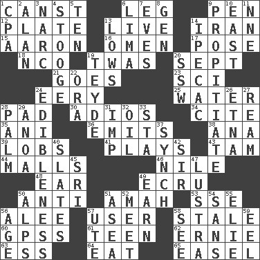 ACROSS 1. 2nd pers. sing. pres. of can (arch.) 6. Part of a journey 9. Animal enclosure 12. Food holder 13. Not recorded 14. SW Asia republic 15. Composer Copland 16. Sign of something about to happen 17. Introduce or present, as a question 18. Non-commissioned officer (abbr.) 19. It was, poetically 20. Back-to-school mo. 21. Leaves 23. _-fi 24. Suggestive of the supernatural 25. Wetness 28. Groovy apt. 30. Goodbye (Sp.) 34. Quote 35. Cuckoo 36. Gives off 38. Santa ___, CA 39. Tennis shots 41. Frolics 43. Scottish cap 44. Shopping centers 46. "Death on the ____" 48. Ewer handle 49. Shade of tan 50. Opposed to 51. Nursemaid 53. Compass dir. 56. Toward shelter 57. One who uses or employs something 58. Lacking originality or spontaneity 60. Global Positioning Systems (abbr.) 61. Adolescent 62. Bert's buddy 63. Double-curved letter 64. Erode 65. Artist's stand DOWN 1. Numbers guy (abbr.) 2. ____ Jay Lerner 3. Drug cop 4. Moe Howard, for one 5. Nine, plus one 6. Pale green bean 7. Nights before holidays 8. Commissioned mil. rank 9. Conciliate 10. 90 degrees 11. Compass dir. 13. Coldest temperatures 14. Medicinal drug used to evoke vomiting 19. Miss Universe 1986, Barbara Palacios _ 20. Compass dir. 22. Mouth or opening 24. The property of being fit to eat 26. Inactive volcano in Sicily 27. 480, 500 or 516 sheets of paper 28. Inside of hand 29. Small Philippine buffalo 31. Naughty child 32. Lubricate 33. R.R. building 37. Synchronize (abbr.) 40. Chalkboards 42. Title for a knight 45. Indian title of respect (Mr.) 47. A period of five years 49. Merit 50. High mountains 51. At sea 52. Confront 54. Without 55. Writer Wiesel 56. Grow older 57. Shoshoni 58. Perceive with the eye 59. Snakelike fish