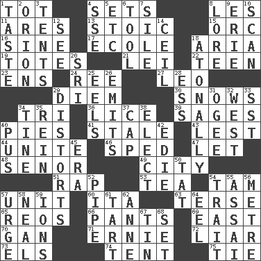 ACROSS 1. Small child 4. Puts into a specified state 8. French article 11. Ancient Greek god of war 13. Unemotional 15. The grampus (Milton) 16. Trig term 17. Learning spot: Fr. 18. Roberta Peters solo 19. Hauls 21. Flowery wreath 22. Adolescent 23. Followers of ems 24. To riddle 27. Lion 29. South Vietnam president (1954) 30. Frozen precipitation (plural) 34. Three (prefix) 36. Louse (plural) 39. Gurus 40. Sliced desserts 41. Having lost freshness 43. For fear that 44. Join together 46. Drove too fast 47. Allow 48. Sir (Sp.) 49. Municipality 51. Strike 53. Afternoon social gathering 54. Scottish cap 57. A single undivided whole 60. Call ___ day 63. Laconic 65. Vintage cars 66. Leg coverings 69. Compass direction 70. Separate the seeds from cotton 71. Bert's buddy 72. One who doesn't tell the truth 73. Raised railways 74. Portable shelter 75. Standoff DOWN 1. Clothes sense 2. Greek mythologigal hunter 3. Portable shelters 4. Compass dir. 5. And so on (abbr.) 6. Utensil 7. Drop; flow; fall 8. Old wives' tales, e.g. 9. One of the Great Lakes 10. Skim 12. Perceive with the eye 14. To provide with a ceiling 18. Lacking a tonal center or key 20. _ Lanka 25. Snakelike fish 26. Sends forth 28. Curvy letter 29. What propaganda does 31. Double curve, resembling the letter S 32. Compass direction 33. Fast jet (abbr.) 34. Prong on a fork 35. It's straight from the horse's mouth 37. Head covering 38. Voters do this 40. Product of festering 42. Singer Brickell 45. Period 50. Make lace 52. Corncob 54. Distinguishing feature 55. Slender Brazilian palm 56. Distance measurement (Brit.) 57. Goad 58. Be tempered by heat 59. Charged atoms 61. Small pie 62. Queen of England 1702-14 64. Snakelike fish 67. Shallow baking pan 68. Put into a specified state